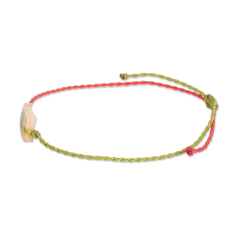 This must-have macrame bracelet features a fabulous coconut shell pendant that boasts a hand-painted exotic quetzal, a tribute to the iconic national bird of Guatemala. Ricardo Gonzalez expertly knots the bracelet's green and red cords using the macrame technique, providing an adjustable sliding knot closure.