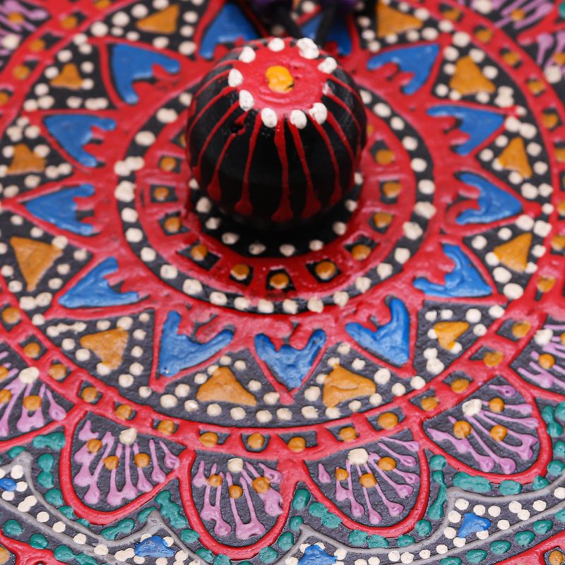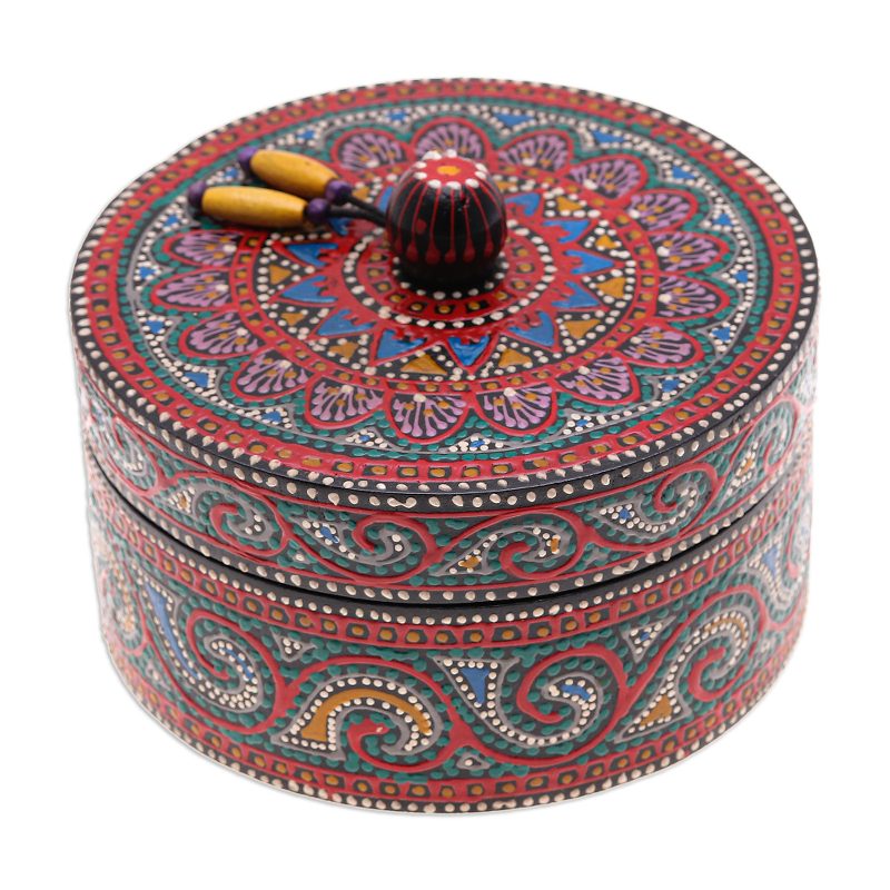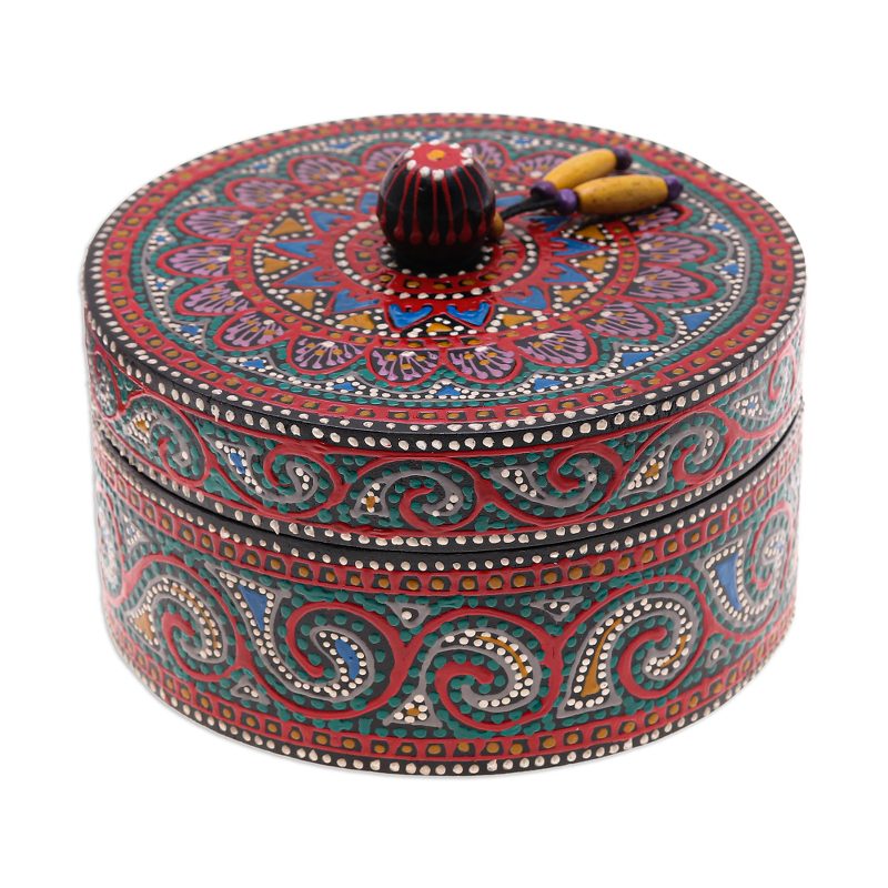 Thailand's Pang and Ni paint by hand a lovely mango wood decorative box with an intricate design. Colorful specks, floral motifs and intense waves decorate the whole item, making it unique. The final touch is in the yellow wood beads on the lid, joined by a sturdy waxed cotton cord.