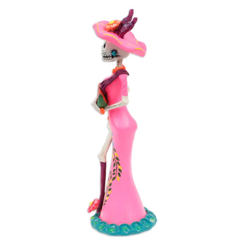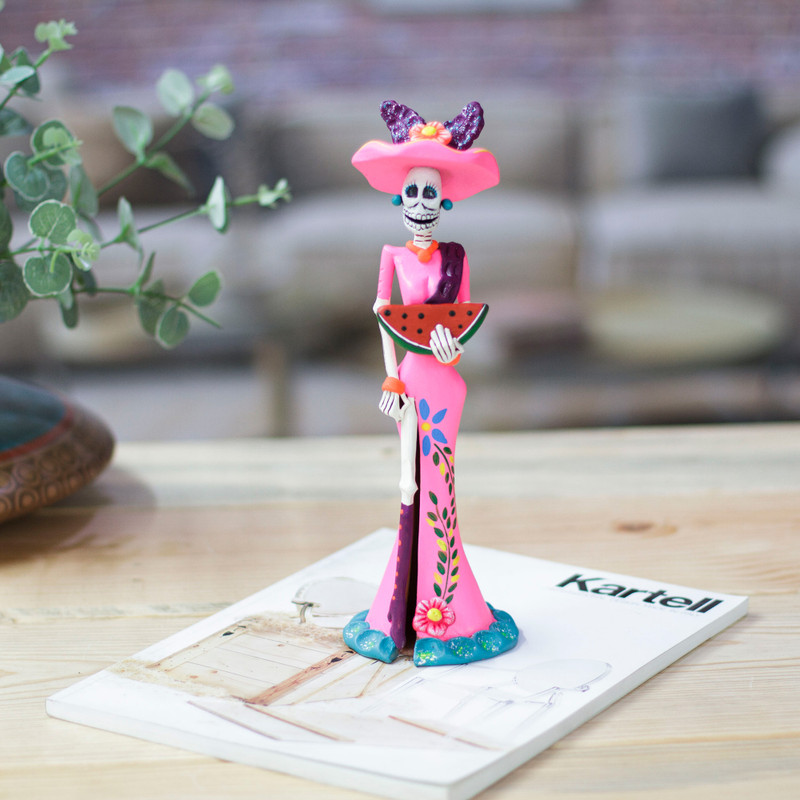 Lady Catrina is ready to enjoy the Day of the Dead and the summer season with a sublime pink dress adorned with floral details, all crafted and painted by master artisan Jorge Escamilla from Mexico. Inspired by the joyous days in the region, the artisan uses ceramic to craft this charming sculpture that portrays this graceful lady on a sunny day, eating a watermelon piece.
