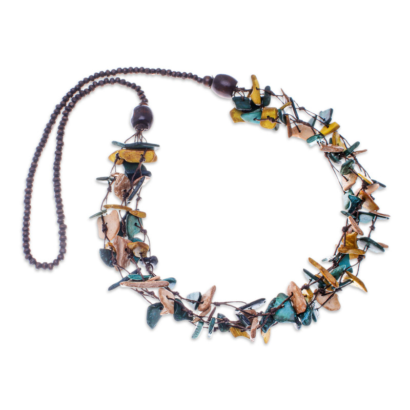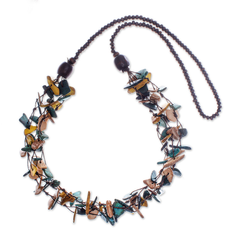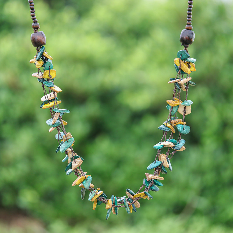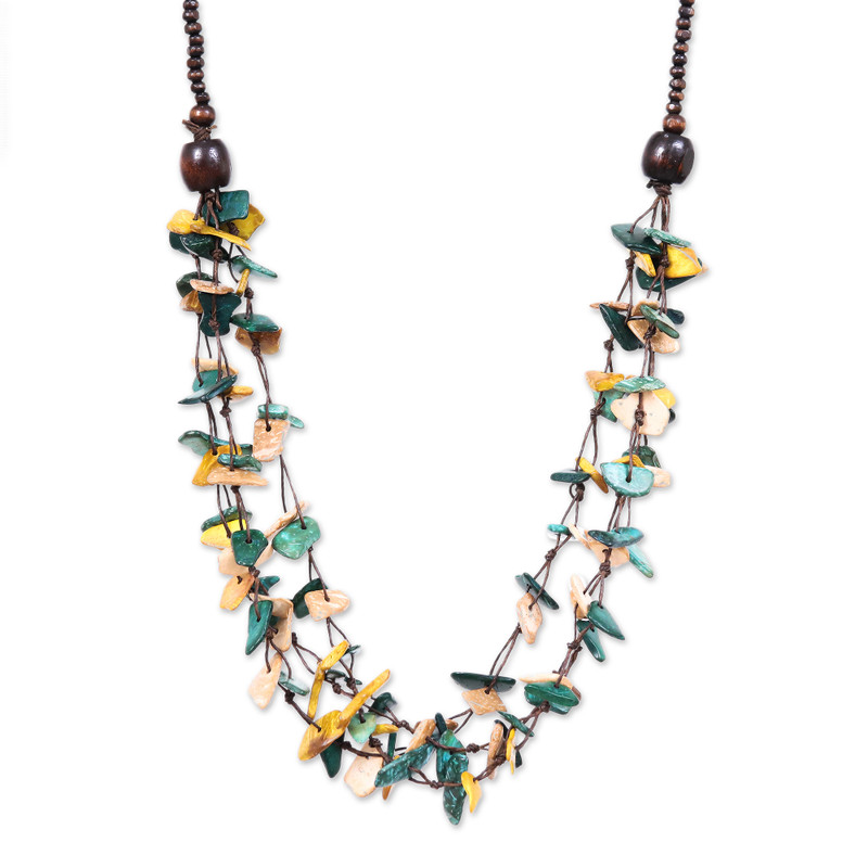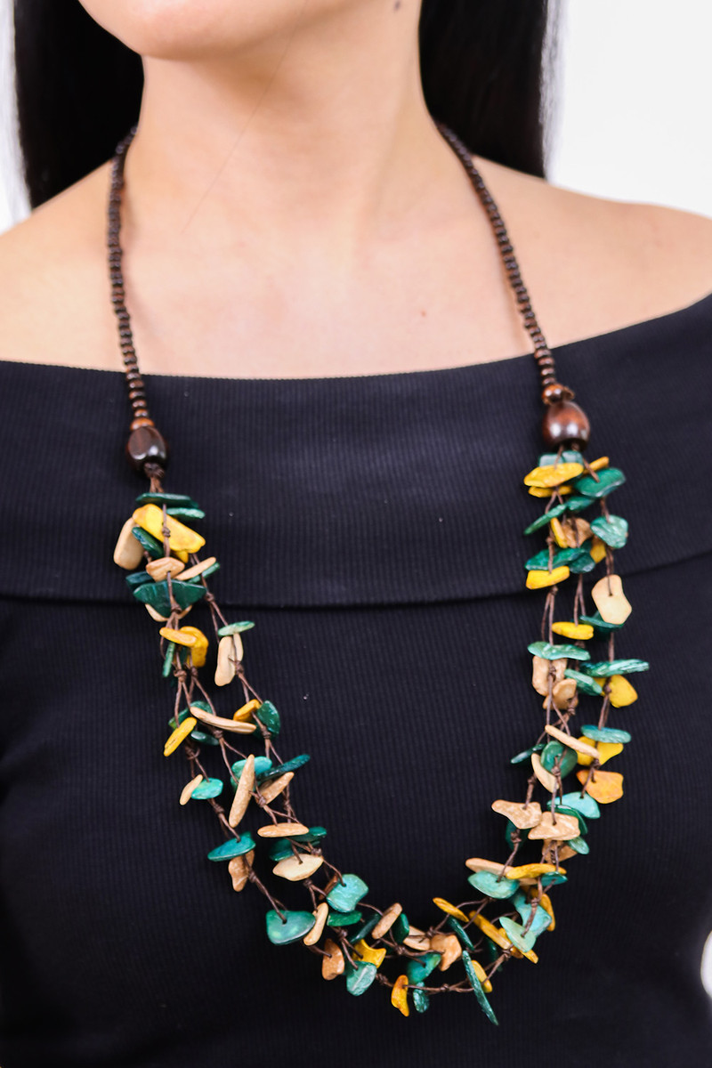 Petite coconut shell pieces in golden and teal hues transform Sumalee Nawakul's newest design into a majestic piece from Thailand's classic artistry. This three-strand necklace complements its regal grace with little leaf wood beads, allowing for a bohemian look.