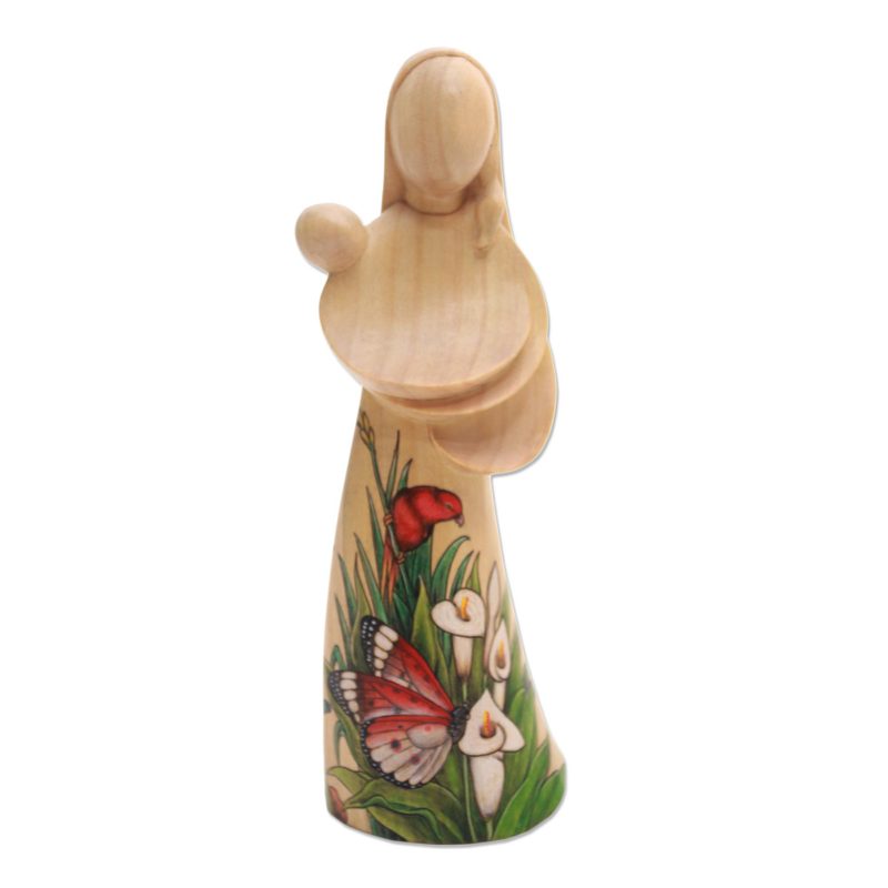 Holding her child in her arms, a mother stands tall and proud. Hand-carved from crocodile wood, this statuette is created by Balinese artisan Gusti Ngurah Semarajaya. He finishes this statuette with a hand-painted design, featuring butterflies that explore a field of calla lilies.