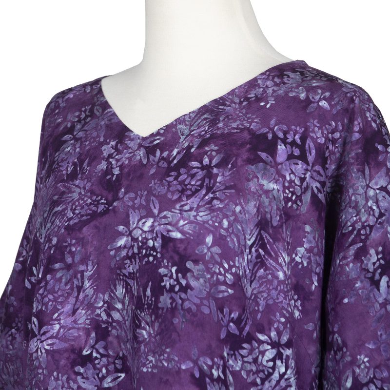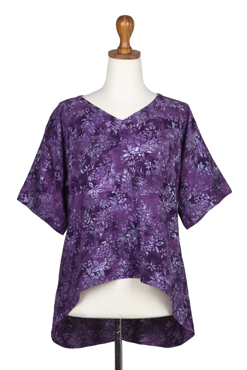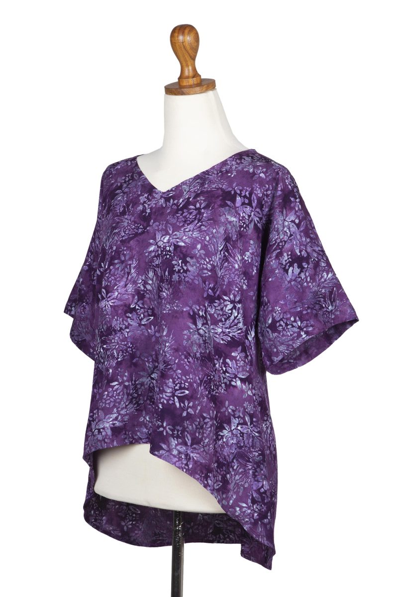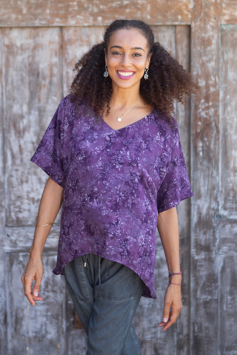 Backed by our 100% Happiness GuaranteeDesigned in shimmering amethyst purple, Galuh Kenanga's beautiful blouse is covered in lily flowers. Hand crafted by Balinese artisans with soda ash--a dyeing technique that creates radiant color--the rayon blouse features a hand-stamped batik print and an elegant high-low hem.