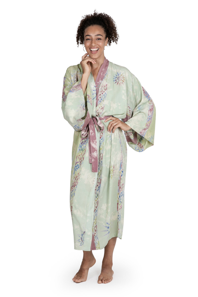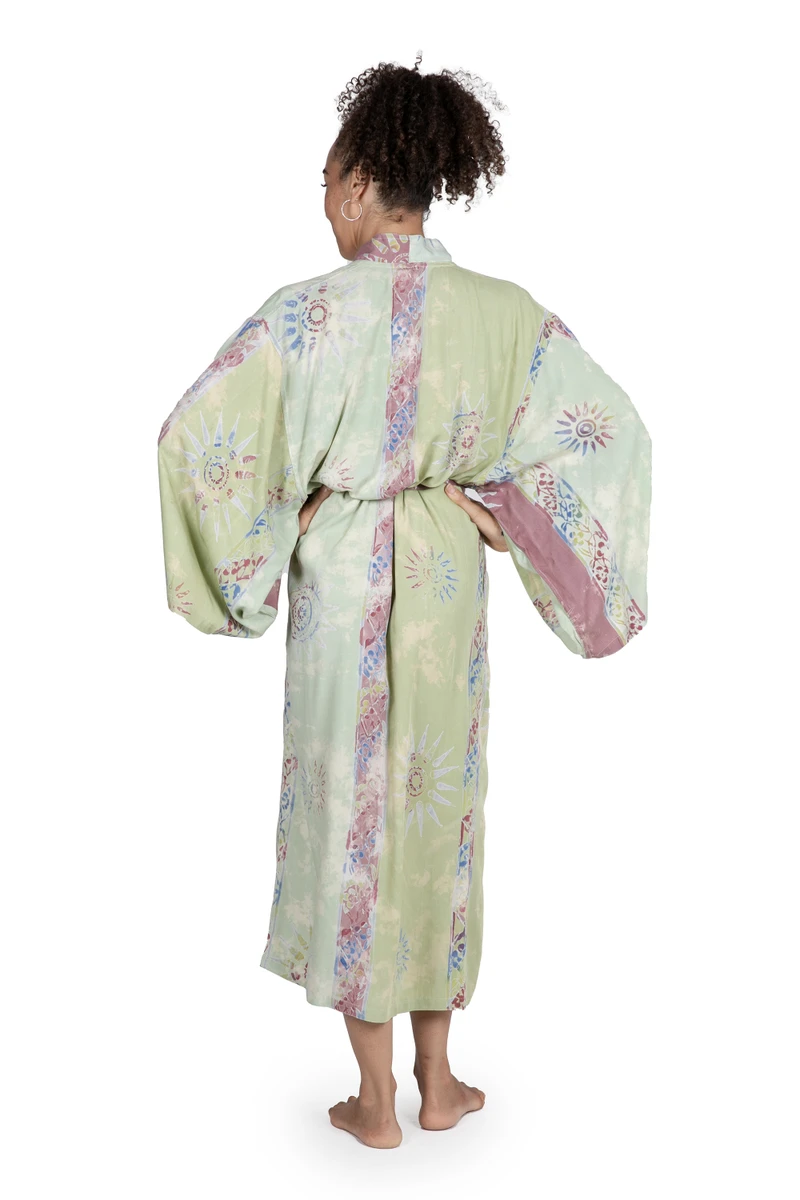 Backed by our 100% Happiness GuaranteeOriginally used for traditional costumes and only worn by royalty, Batik is now listed as a masterpiece of intangible cultural history by the UNESCO. Batik arts are deeply rooted in Indonesian culture and have been passed down through generations. The wax resist dying and multi-step processing is also dependent on the weather, with sunlight determining the final outcome of each piece of fabric. Ancient symbols and natural colorssuch as sage and rosewood combine in this wearable work of art from textile artist Desak Nyoman Parwati. The soft 100% rayon long robe features wide sleeves, two front pockets and a matching tie belt.