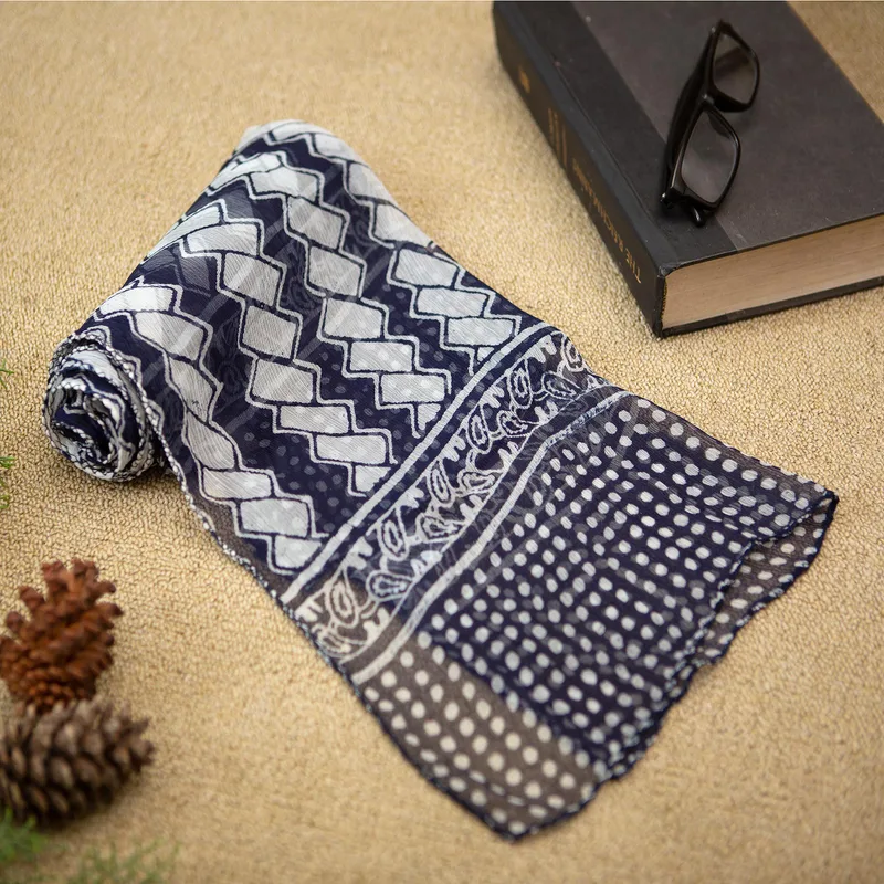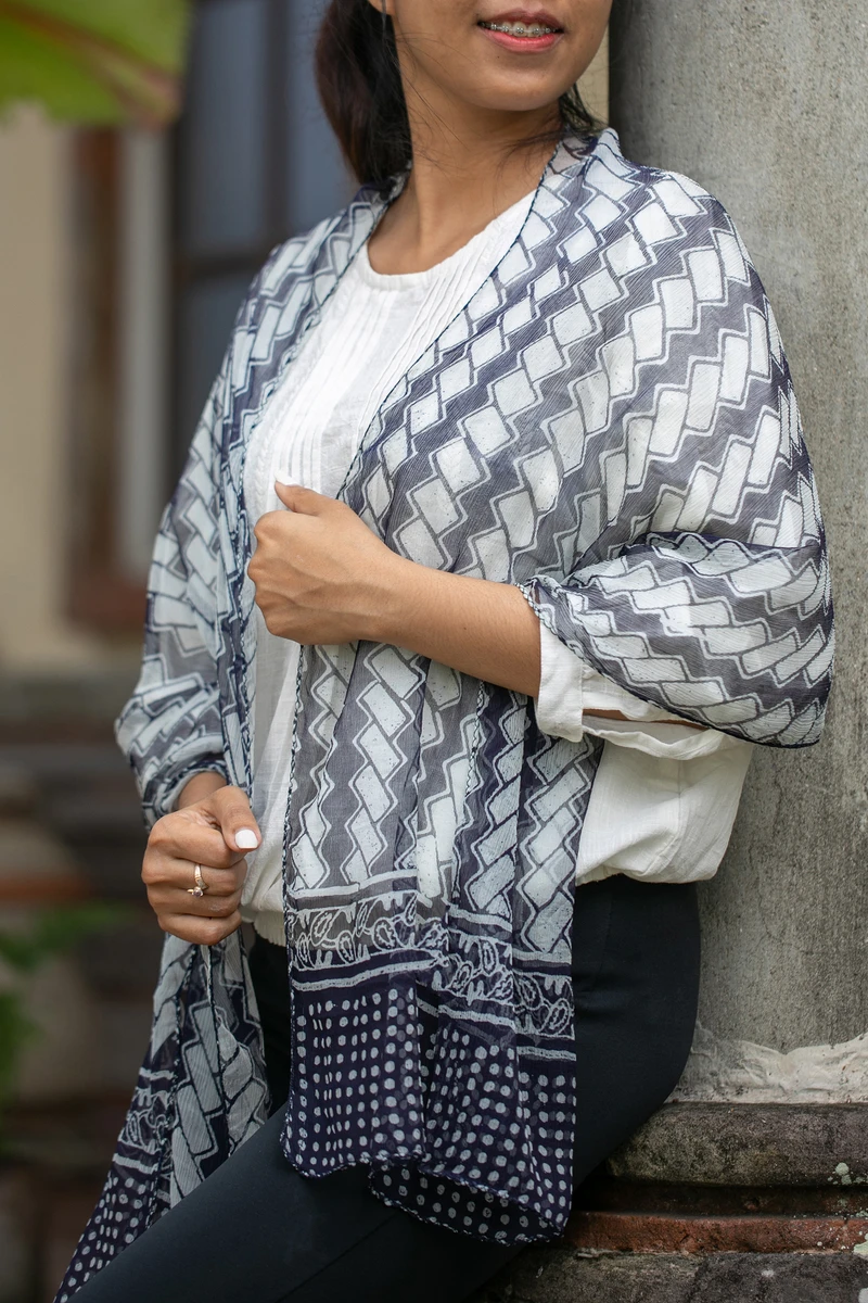 Light as air, Dewa De Wardana's eco-friendly chiffon shawl is dyed with organic indigo, which produces a beautiful navy color. The Balinese artisan hand stamps the silk chiffon fabric with a lively zigzag pattern that dances horizontally across the lightweight shawl.