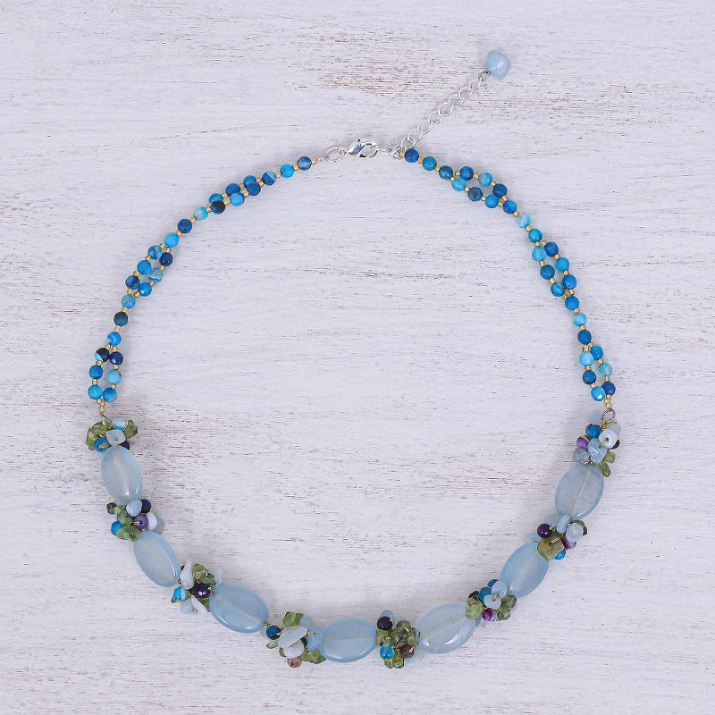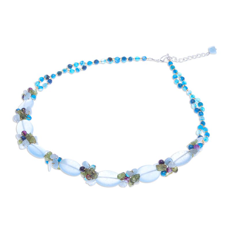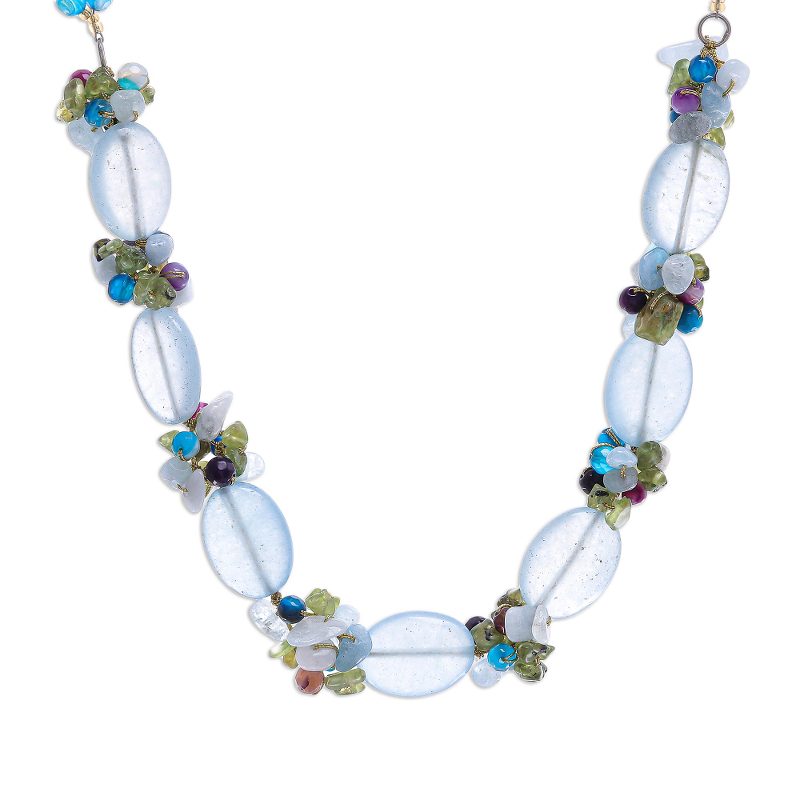 Backed by our 100% Happiness GuaranteeYou don't have to be a mermaid to wear this cool, gemstone-loaded necklace from Thailand's Nareerat. The artisan hand knots blue and purple agate, peridot, and aquamarine into clusters using gold silk thread. Translucent blue quartz beads alternate with the gemstone clusters, while a sterling silver-plated brass clasp and extender chain finish the necklace.