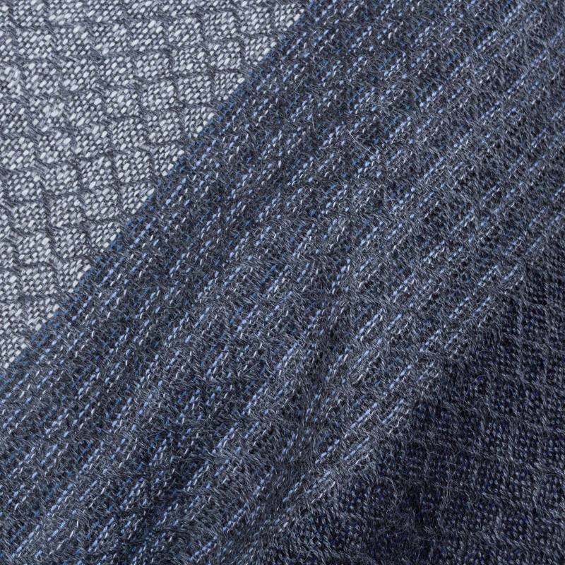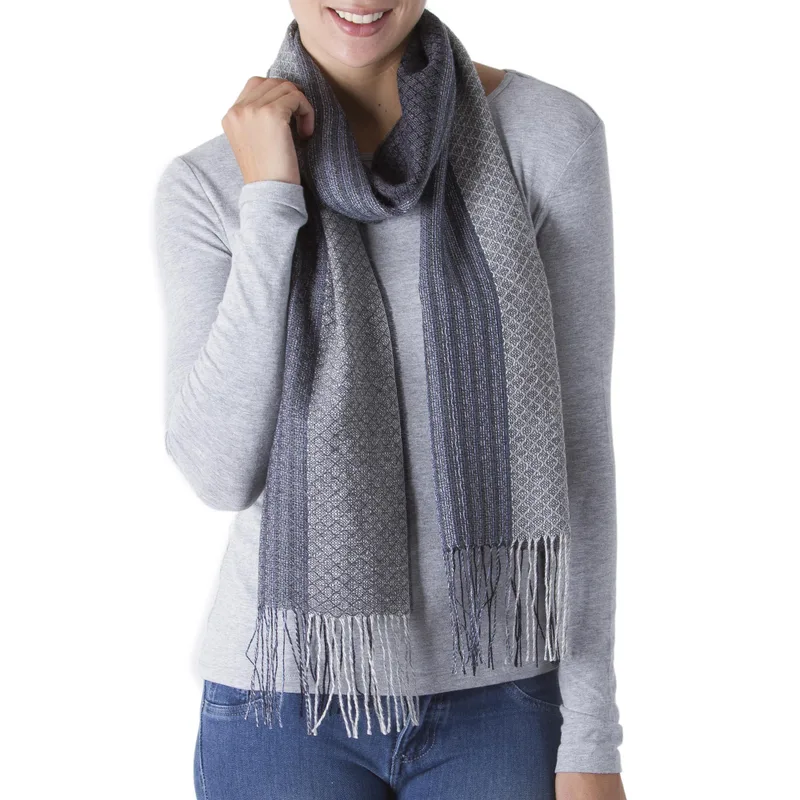 Featuring stripes in ivory, deep grey, and navy, this Peruvian scarf by Raquel and Gregor is woven of a soft baby alpaca blend. Its intricate textures and rich colors make it endlessly versatile. Baby alpaca refers to the fine fleece from the season's first shearing.
