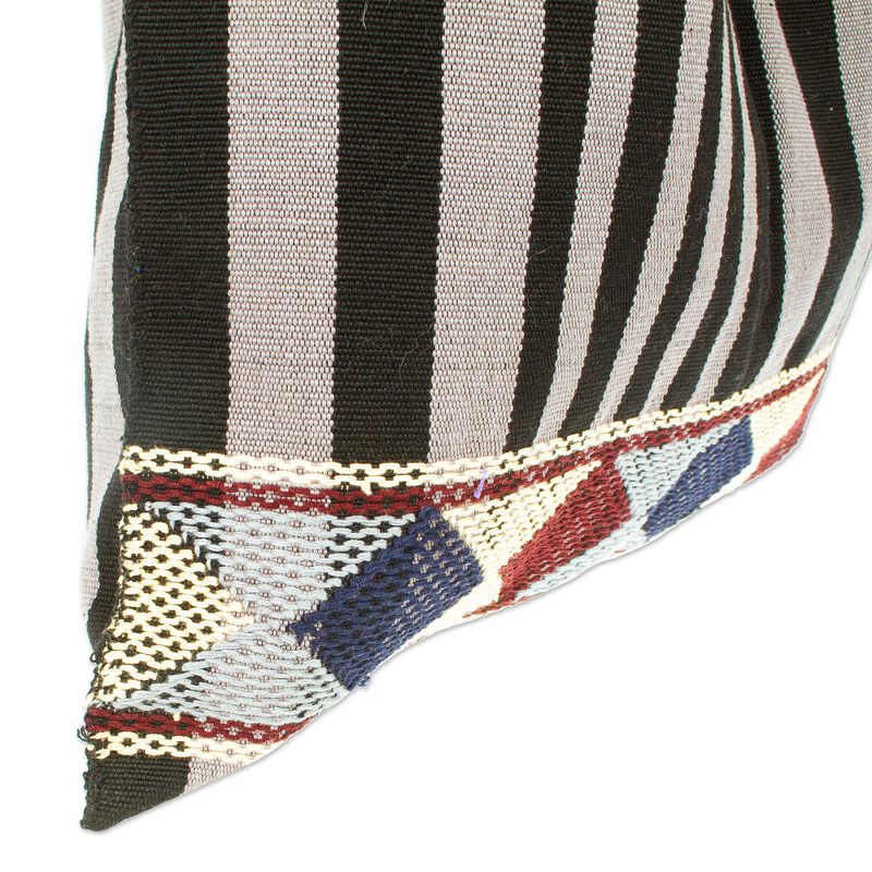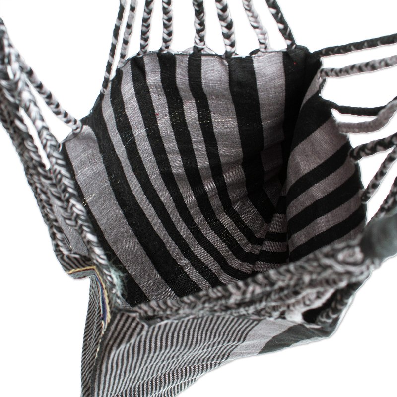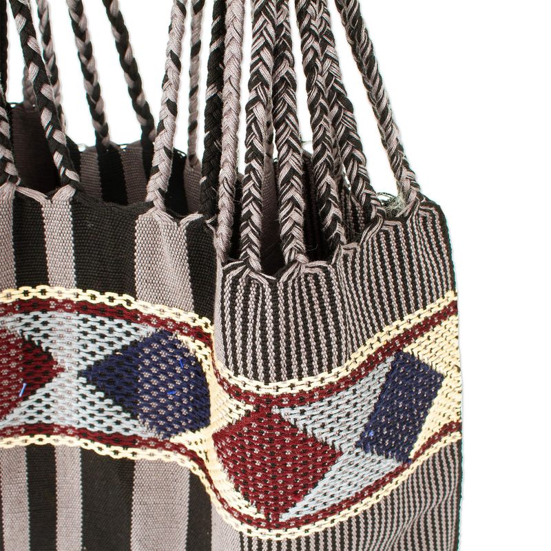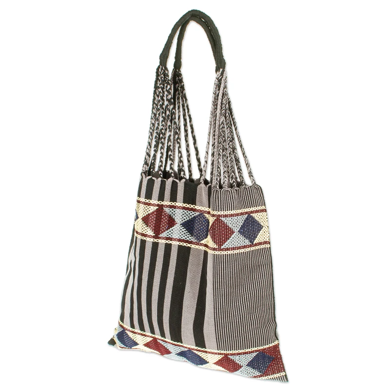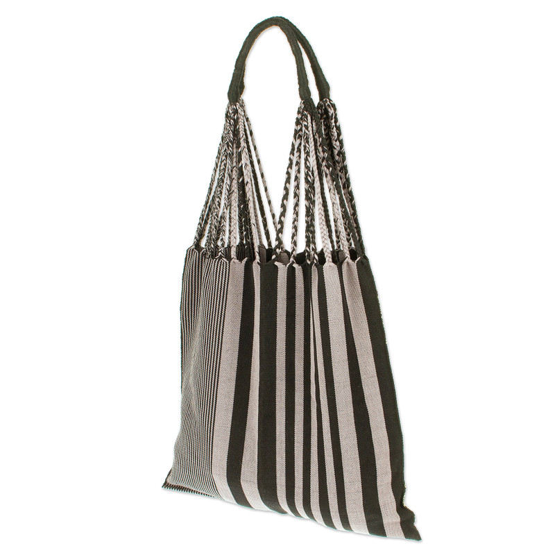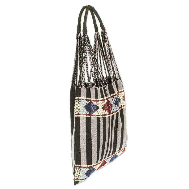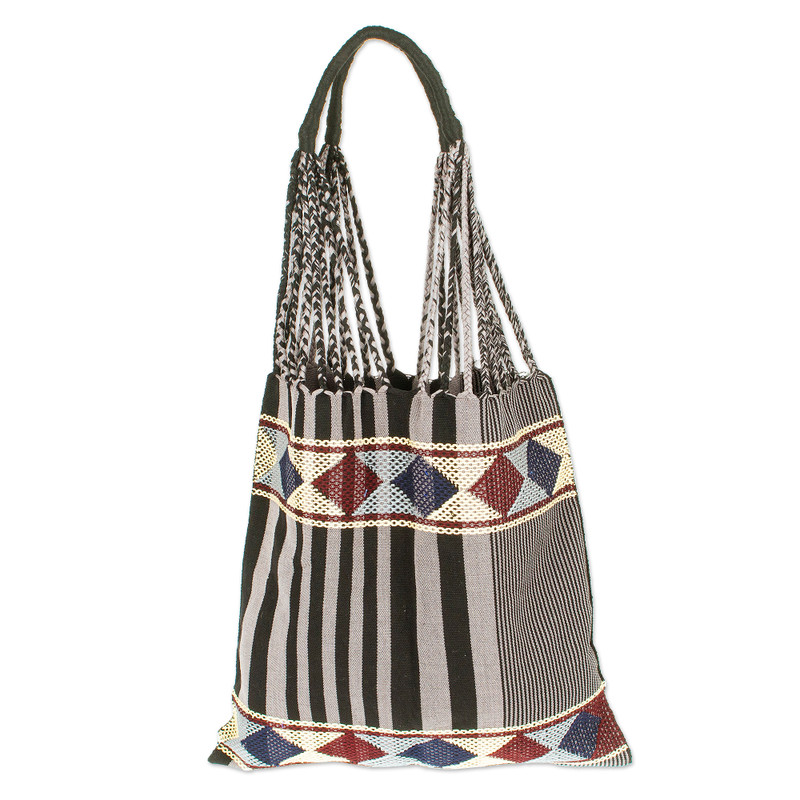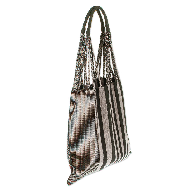 Combining unevenly spaced neutral lines superposed by an understated geometrical pattern in midnight, mahogany and parchment, Petrona Perez and the Women Artisans Association create this elegant tote customary of their native Chiapas, Mexico. The artisans construct the one-piece shoulder bag from 100% cotton using waist looming to produce the body, a technique passed down through generations, integrating the strap by braiding the remaining length of each thread. The interior is composed of a single large compartment, with one opening through the top.