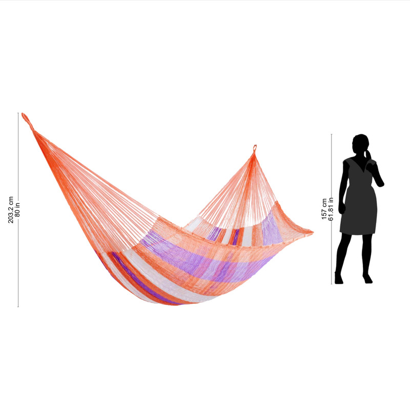Handwoven from nylon fibers in melon, lilac, and white, this double hammock is crafted by Mexico's Maya Artists of the Yucatan. The artisans present the hammock as part of an effort to preserve the traditional Mayan form of hammock weaving, with a comfortable, lightweight design.