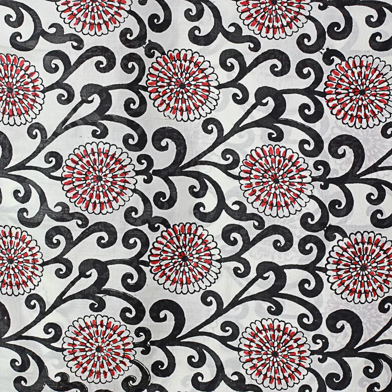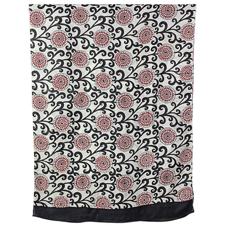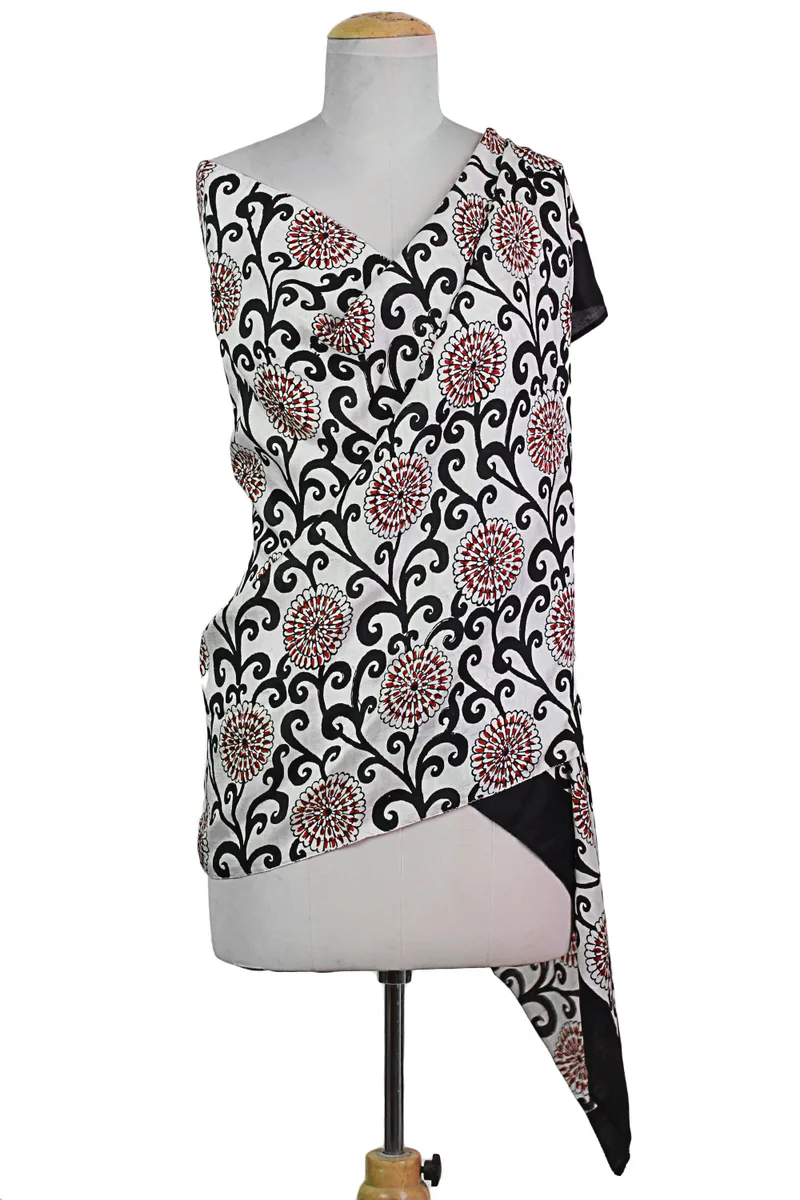 Rajnandinee and Srabonti are two friends from India who work together to produce beautiful clothing and accessories. Handwoven from 100% silk, this ivory shawl features block printed floral motifs in black and candy apple red that are reminiscent of traditional designs painted on the floors of Bengal houses before deity altars.