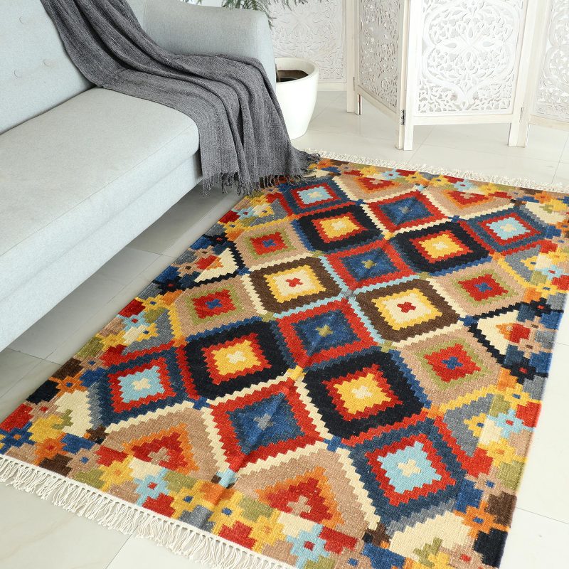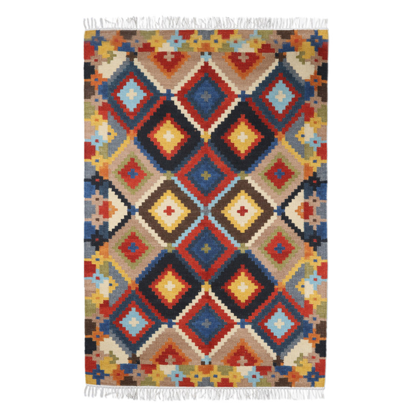 Modern and chic, Ashfaq Ahmed's diligently crafted area rug takes as long as five days to finish. Woven by Indian artisans on a traditional handloom, the wool rug features a bright geometric pattern with a cotton warp, along with a row of playful fringe on either end. Available in two sizes, the rug makes a colorful addition to your home.