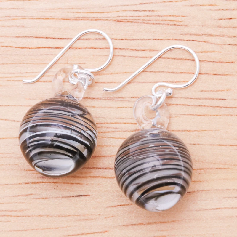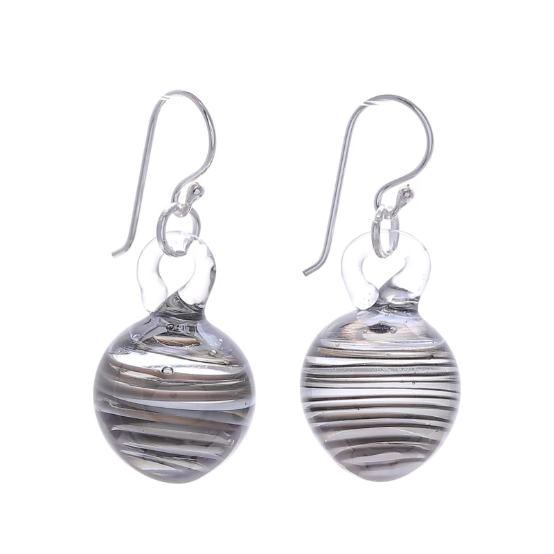 Little drops of handblown glass decorate these dangle earrings with abstract beauty. Thai artisan Panapai uses his expert eye to craft these sublime accessories, whose clear look is completed by black swirls as a symbol of sophistication. In addition, sterling silver hooks allow comfortable wear.