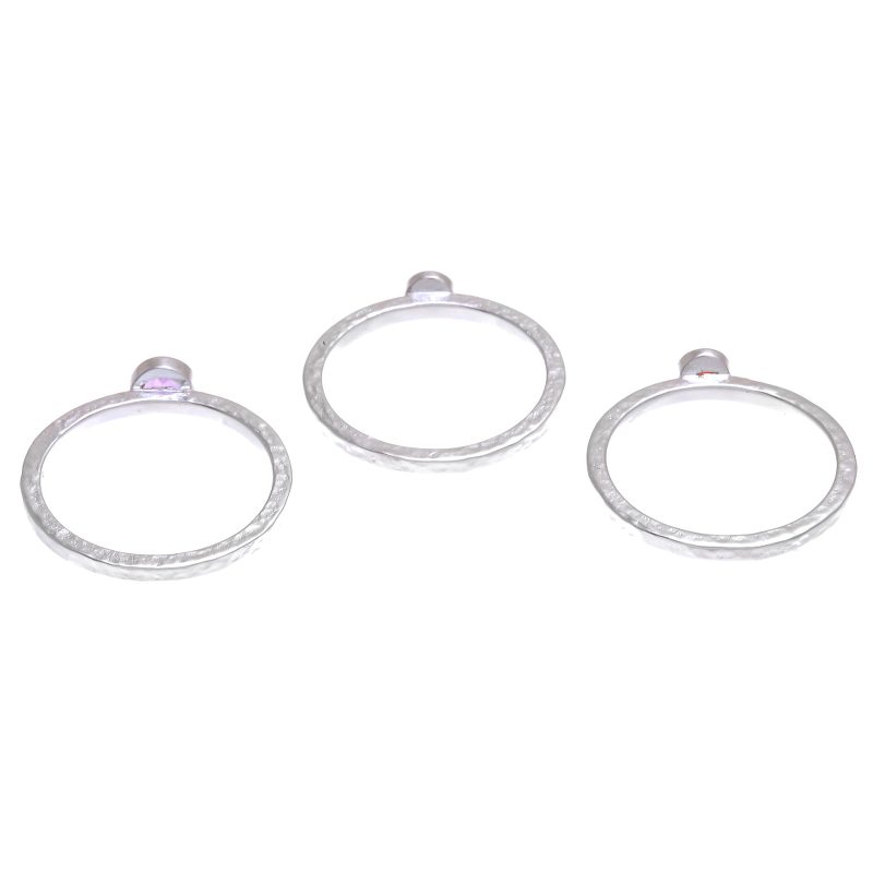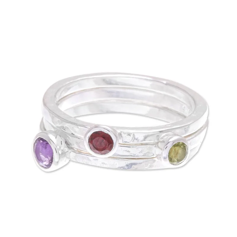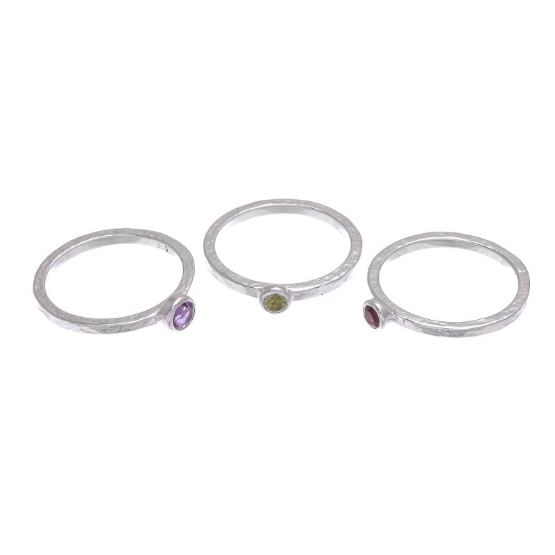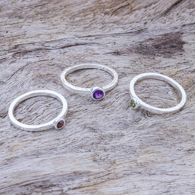 Designed to mix and match, three stacking rings enclose the colors of spring. Jantana works in sterling silver to create solitaires in amethyst, garnet and peridot. They can be worn together or separately.