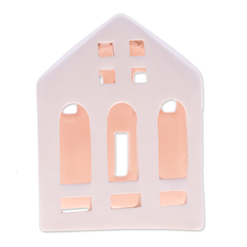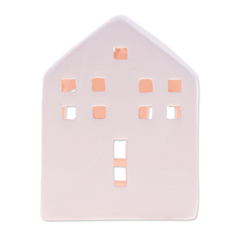 Backed by our Happiness GuaranteeDiscover the perfect fusion of artistry and tranquility with this charming ceramic tealight holder by Thai artisan Paiboon. Hand-painted in a soft pink hue, this delightful house design emanates a sense of serenity that instantly captivates the senses. Complemented by a tealight candle, this one-of-a-kind decorative accent effortlessly infuses any space with a warm, inviting ambiance.