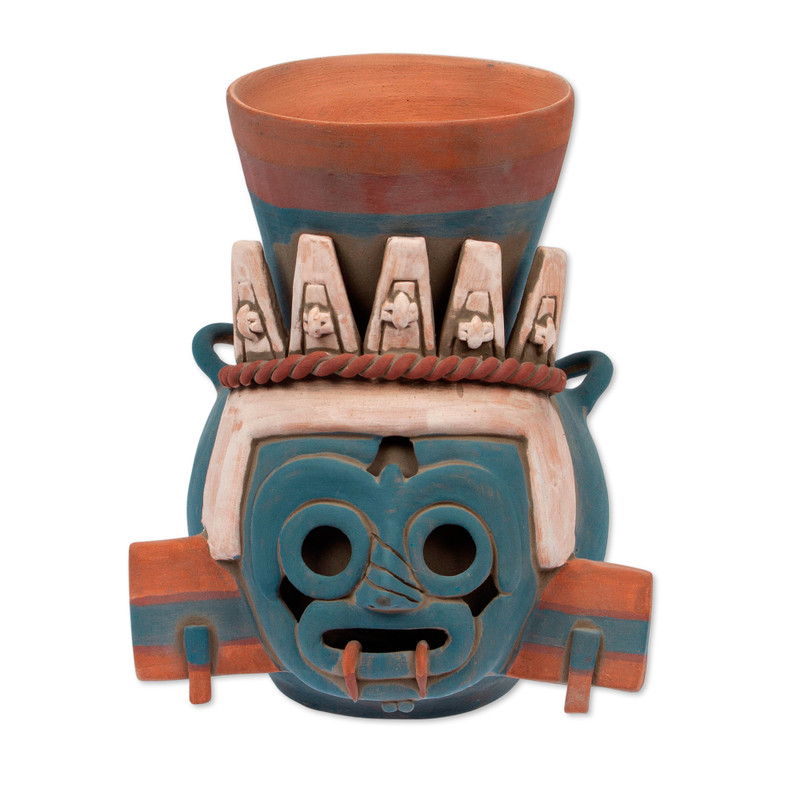 Backed by our 100% Happiness GuaranteeWith sharp red fangs and his characteristic round eyes, Tlaloc is the Aztec god of rain and lightning. Angel Cerón replicates an ancient polychrome vessel that dates from 1440 to 1469 A.D. The original is in the National Museum of Anthropology in Mexico City.