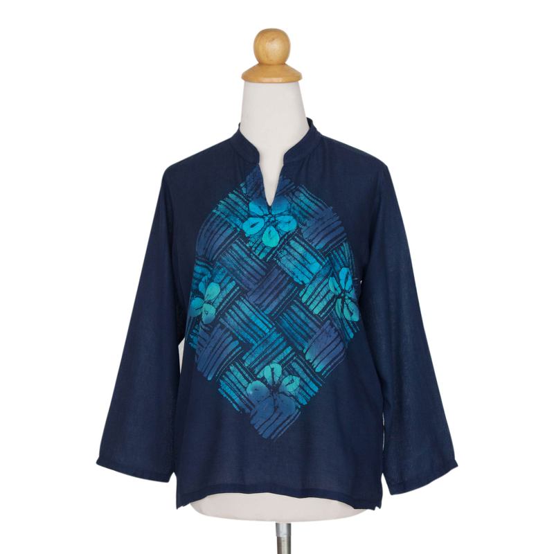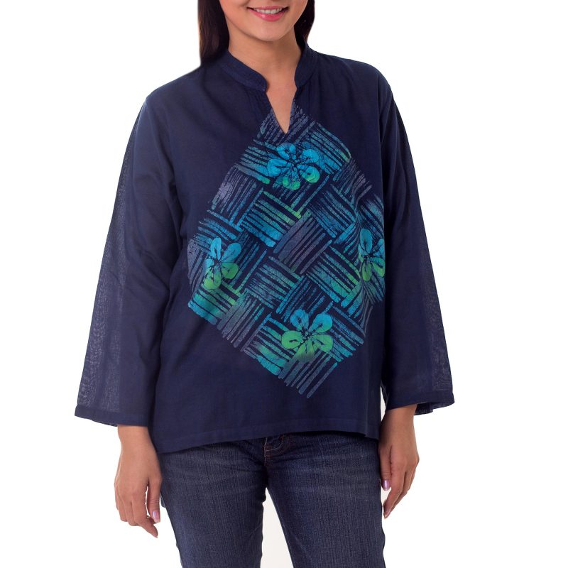 You can find our cotton batik tunic 'Blue Frangipani Universe' by Chomsuda Samana in clothing categories such as Floral Tops, Cotton Tops and Tunics Tops. Enjoy exploring these sections for other Novica treasures.