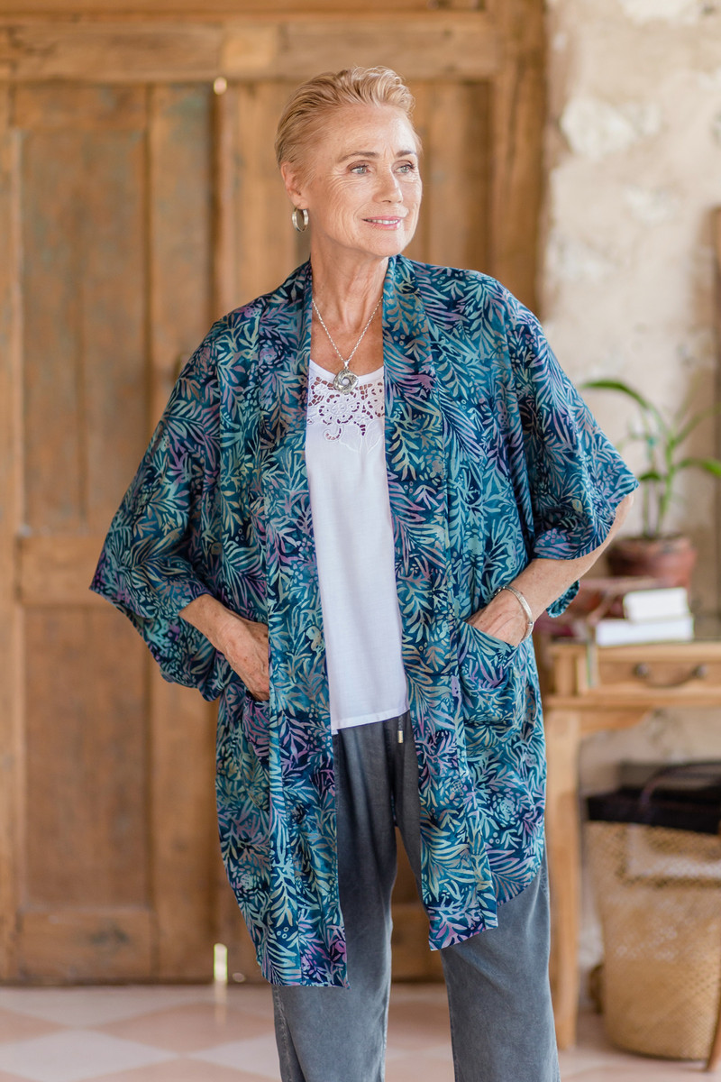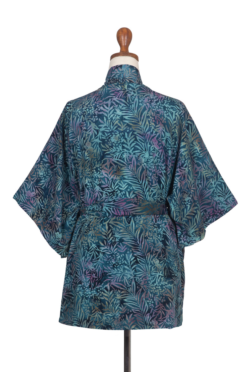 Backed by our 100% Happiness GuaranteeInspired by the beauty of the jungle and its unique nightscapes, Galuh Kenanga designs a charming kimono jacket intended to be an elegant complement to a relaxing day. Balinese artisans use the traditional batik technique to create an intricate pattern in teal, turquoise and purple hues all over this rayon design. With a matching belt and three-quarter-length sleeves, the final touch is a handy pair of pockets.