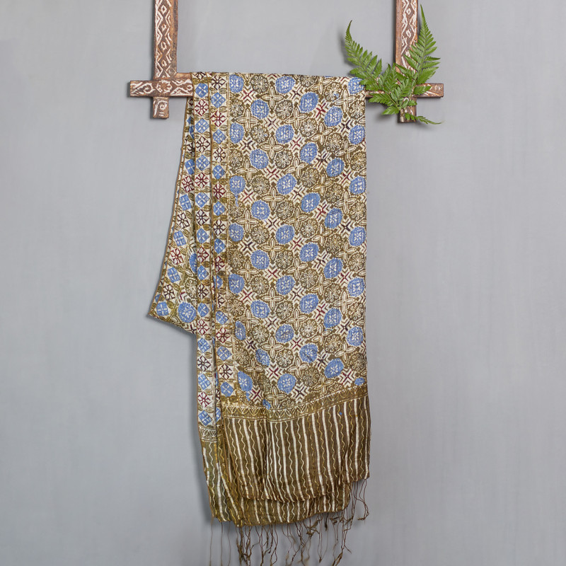 Backed by our 100% Happiness GuaranteeStars and flowers alternate in pastel tan and misty blue. Covering a silk shawl with beauty, the batik motifs are the creation of Yuni Kristina.