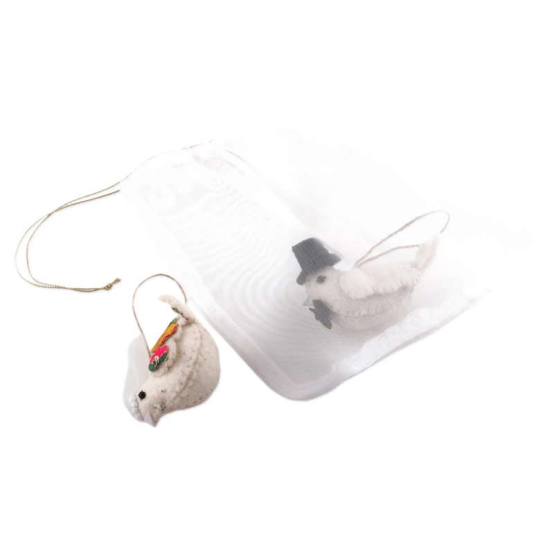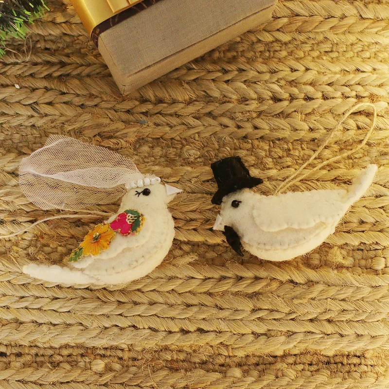 It is time to celebrate the triumph of love in these magical days! Indian artisan Pramod Panwar recreates the joys and beauty of romance with a bird bride and groom pair of ornaments, each made with meticulous talent from wool felt. The groom wears a cute top hat and bowtie in classic black hues, while the dazzling bride ornaments her look with zari textiles, sequins and glass beads. The set also comes equipped with jute cords and a storage bag.