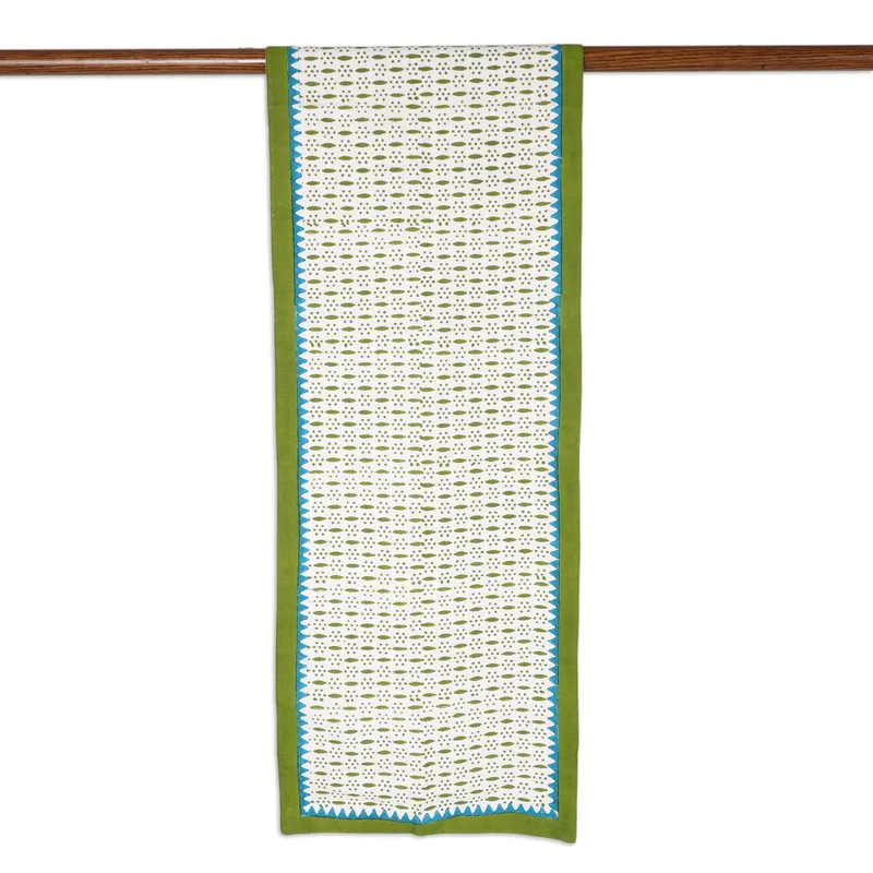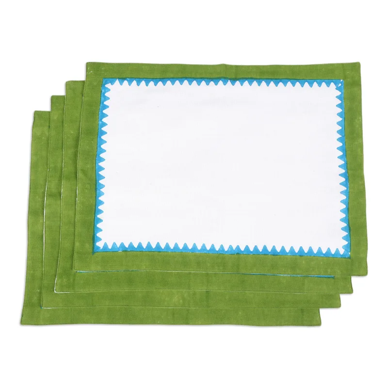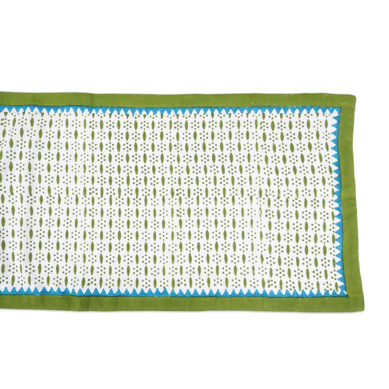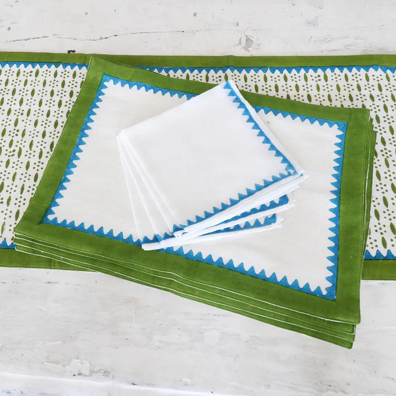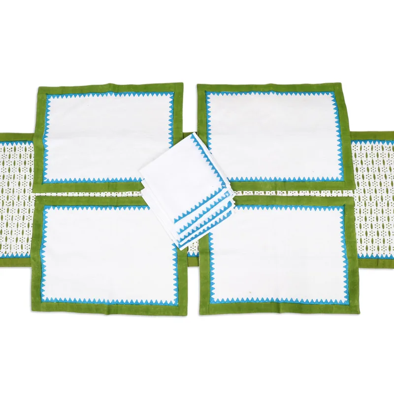 Artisans from SEWA, a nonprofit craft cooperative that champions women's rights, this table linen set is a pretty addition to any table. The set includes a table runner, four placemats, and four napkins, all with festive green and turquoise block-printed patterns.
