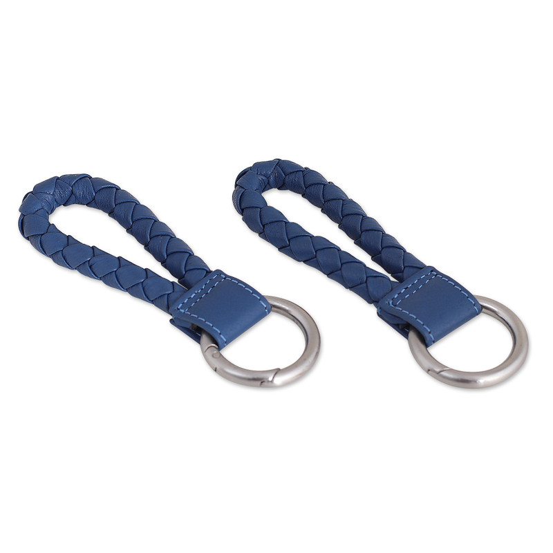 Leather braids in azure hues are neatly crafted to create this pretty pair of key fobs by Sanchit from India. The accessories are attached to nickel-plated brass rings, allowing for handy and durable use.
