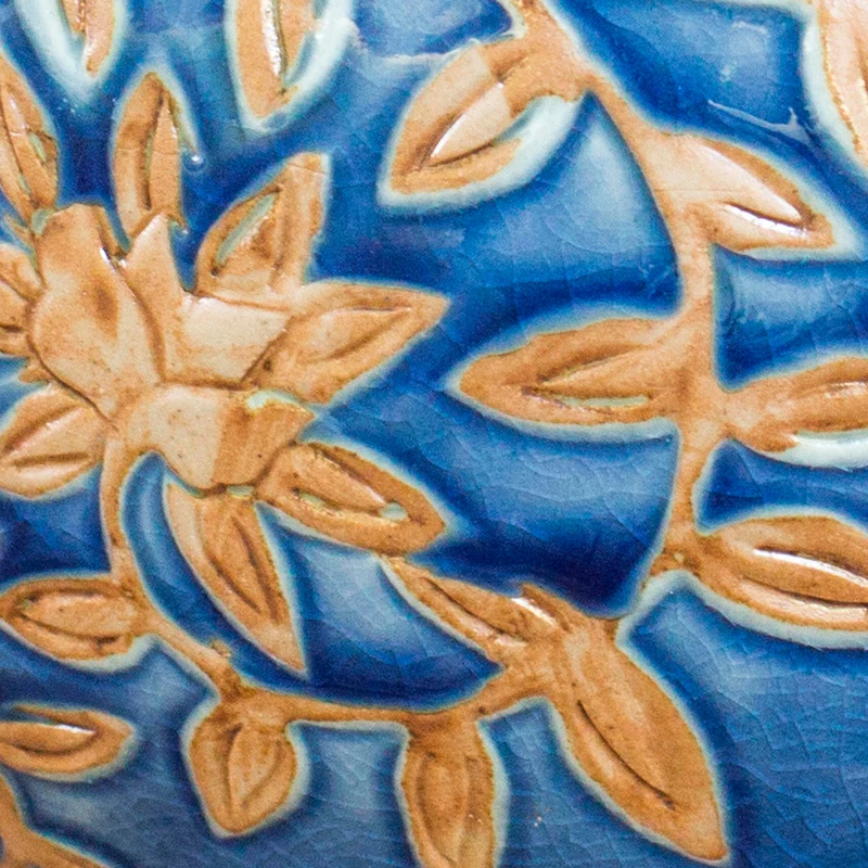 Evoking golden jasmine blossoms on leafy vines, Duangkamol creates a beautiful vase. The voluptuous globe is bathed in deep blue glaze while the low relief motifs reveal the natural color of the clay. The vase exhibits the crackled finish of true celadon ceramics.