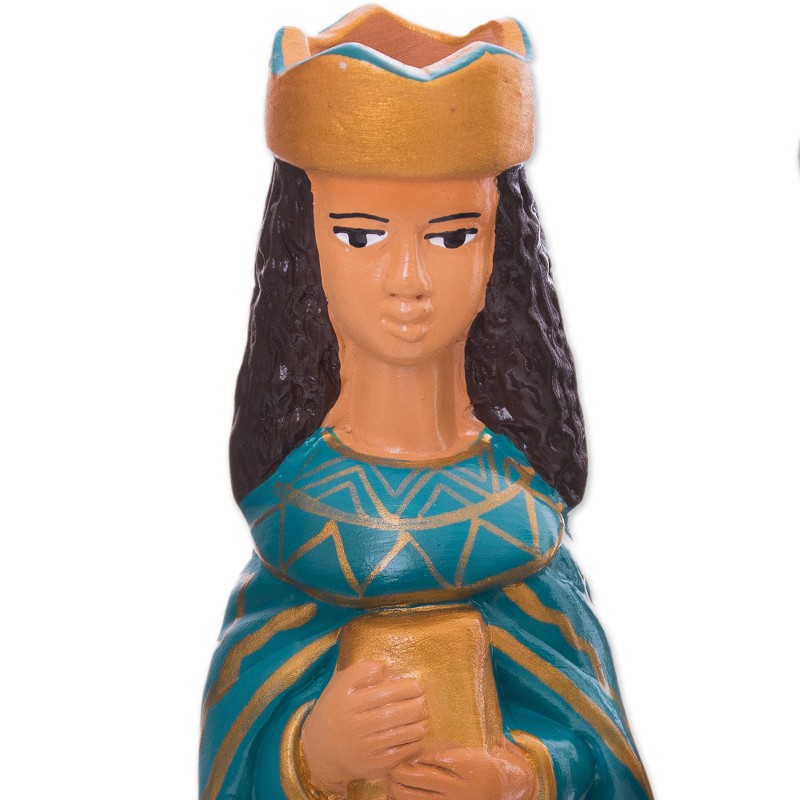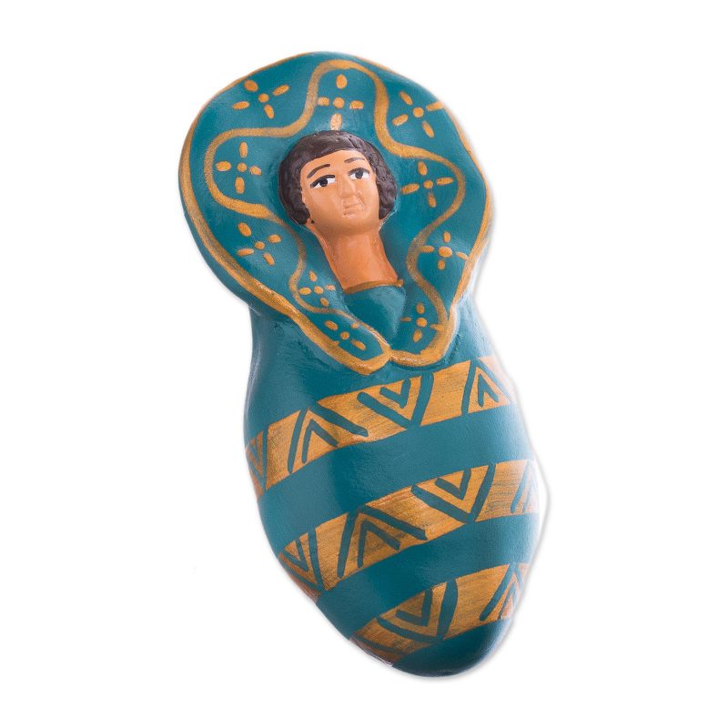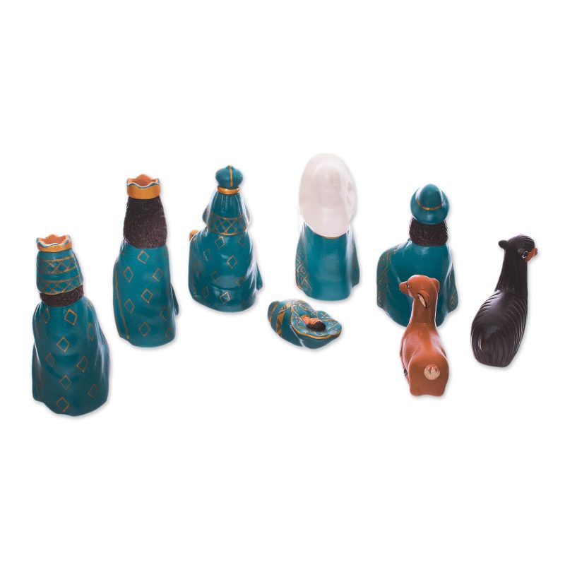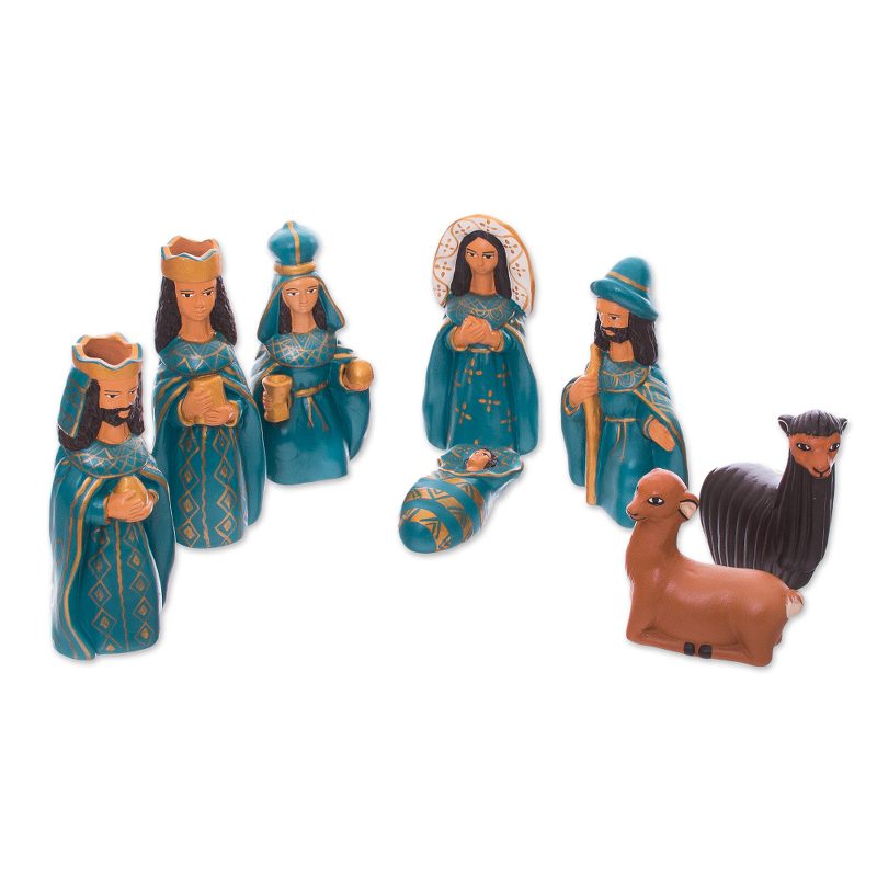 By Feriberto Aylas, this nativity scene from Peru will add a touch of reverence to your home decor this holiday season. Crafted of ceramic, Mary, Joseph, the three wise men, and two farm animals surround the swaddled baby Jesus. Each character is dressed in blue with hand-painted gold-tone accents.