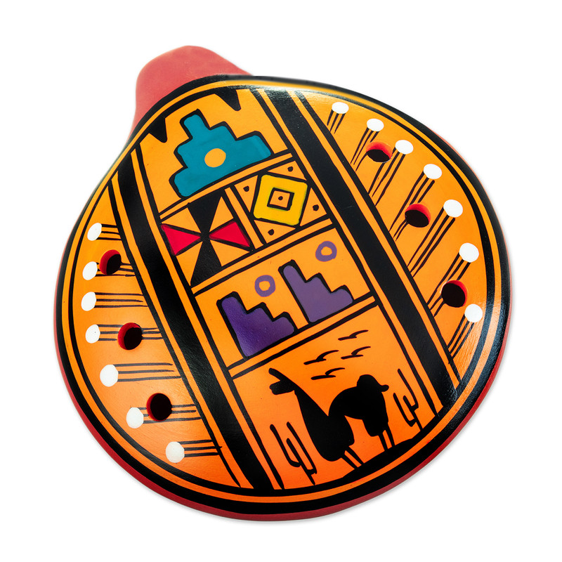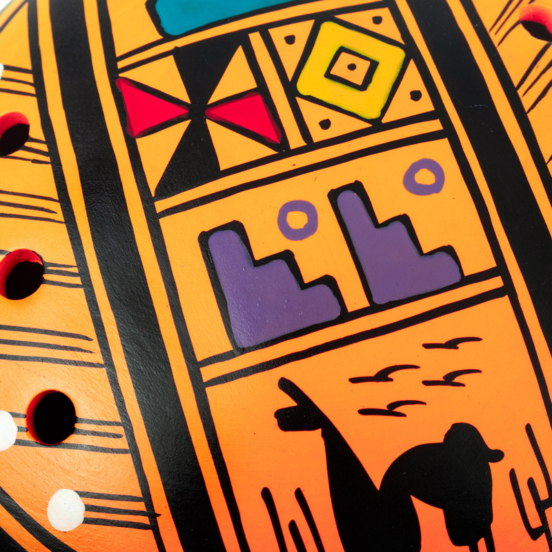 Artisan Dionisio Quilla often depicts traditional motifs in his works as a homage to his beloved country. This time, he handcrafts a gorgeous ceramic ocarina embellished with an Andean multicolor pattern over an orange color. This lovely ocarina is perfect for adding a musical touch and bringing a little piece of Peruvian culture to your interiors.