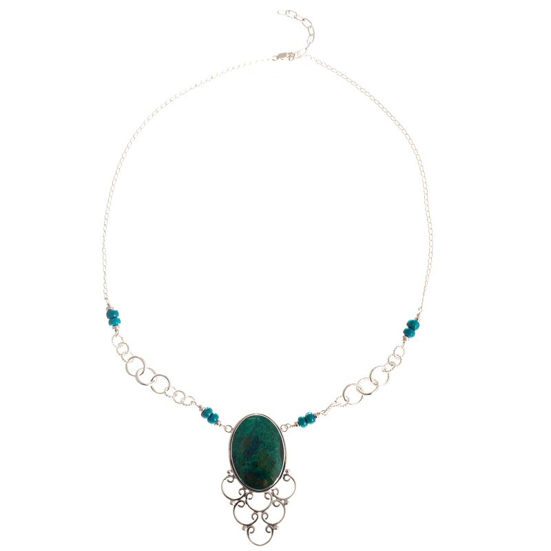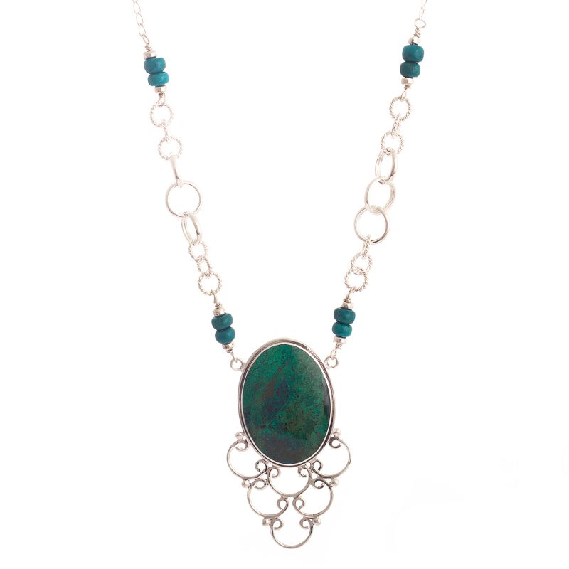 Backed by our 100% Happiness GuaranteeThe fascinating natural variegation of chrysocolla is showcased in this beautiful pendant necklace from Fermin in Peru. The necklace is crafted from Andean sterling silver with a polished finish. A large bezel-set cabochon gemstone is accompanied by smaller chrysocolla beads along the chain.