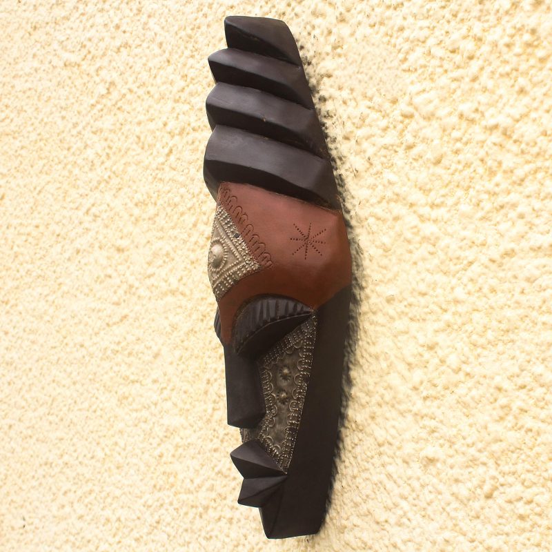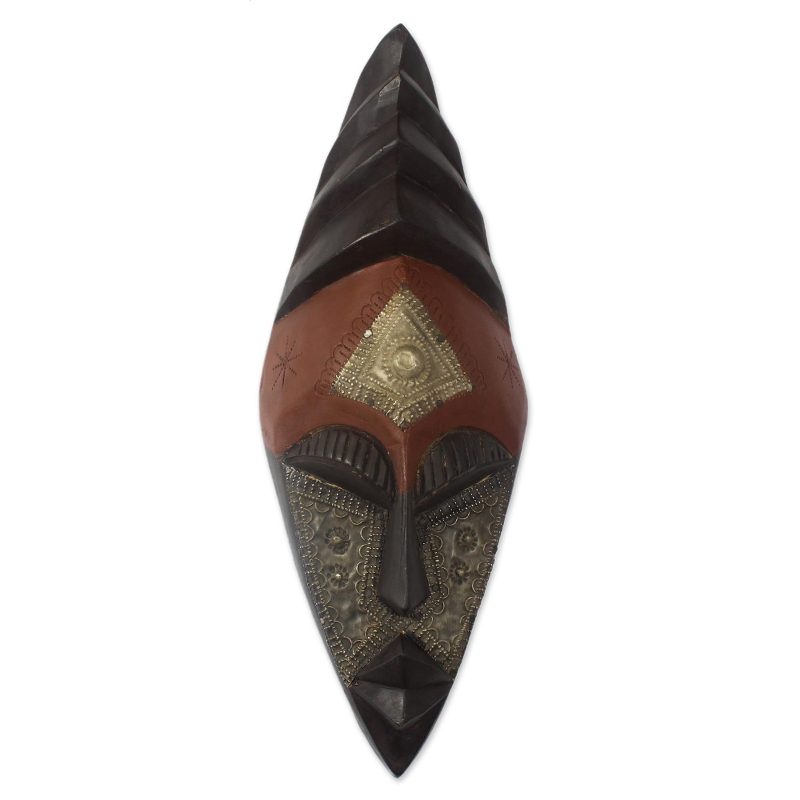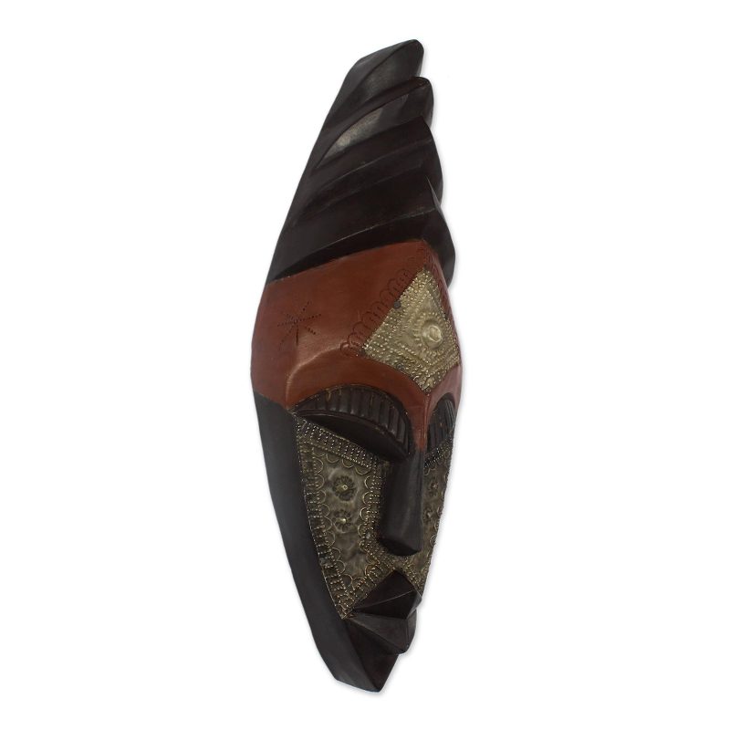 Backed by our 100% Happiness GuaranteeThis highly stylized mask represents a personage who wears a turban. Richly adorned with aluminum repoussé, its colors are red and black. "This mask is worn by the selected few in the Democratic Republic of Congo. Its purpose is for maintaining order in the community," artisan Robert Nortey explains. "These masks are meant for use on ritual or political occasions to arbitrate conflicts and punish wrongdoers."