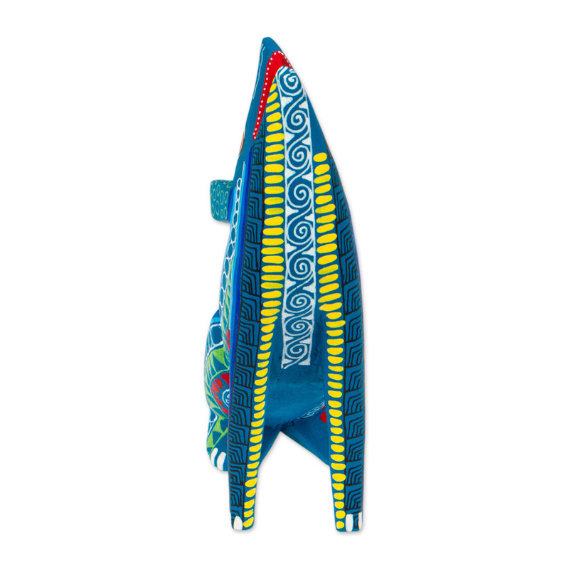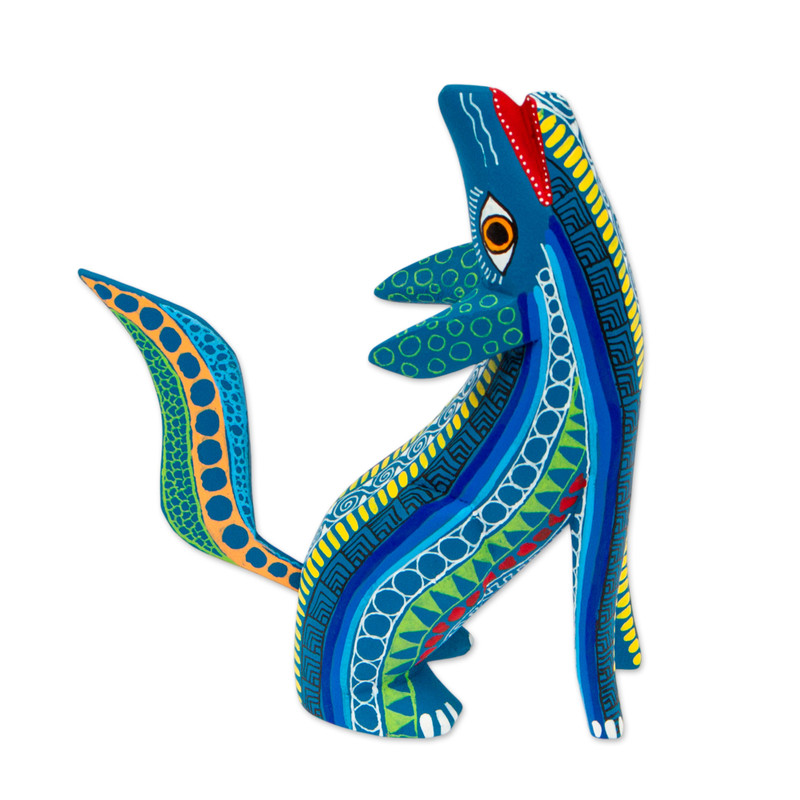 Artisans Jesus and Roxana Hernandez of Mexico handcraft this charming coyote alebrije figurine. Painted in colorful shades such as cerulean and light olive, the copal wood coyote takes a howling pose. Small parts are separated for shipping to protect from breakage.