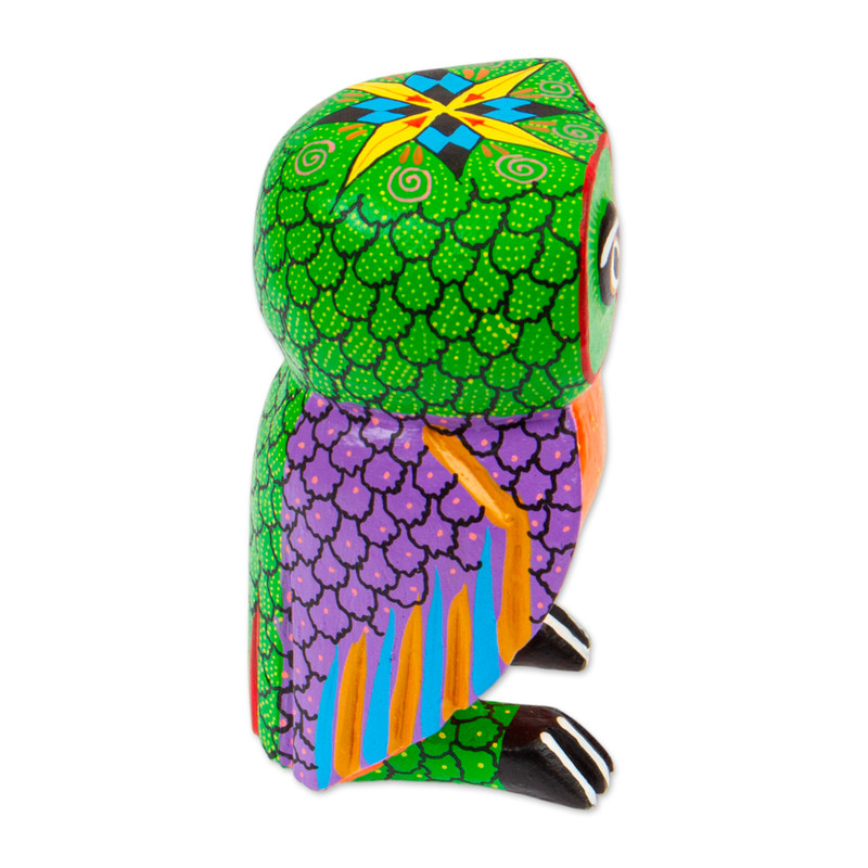 Painted in happy shades of spring green, sunrise orange, and violet, this charming owl figurine is sure to brighten up any room. Artisans Jesus and Roxana Hernandez handcraft the owl from copal wood, decorating it with the detailed motifs that give alebrijes their distinctive appearance.