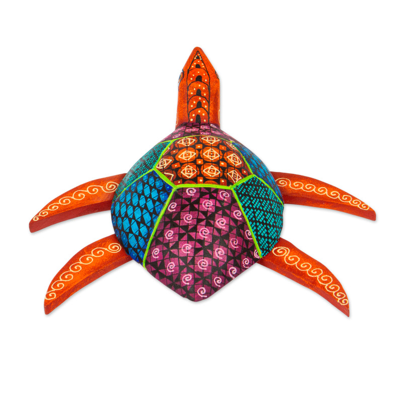 This charming multicolored turtle figurine from Mexico will be a cheerful addition to your home decor. Artisans Jesus and Roxana Hernandez handcraft the turtle from copal wood, painting it with the detailed motifs that are distinctive to alebrije artwork.