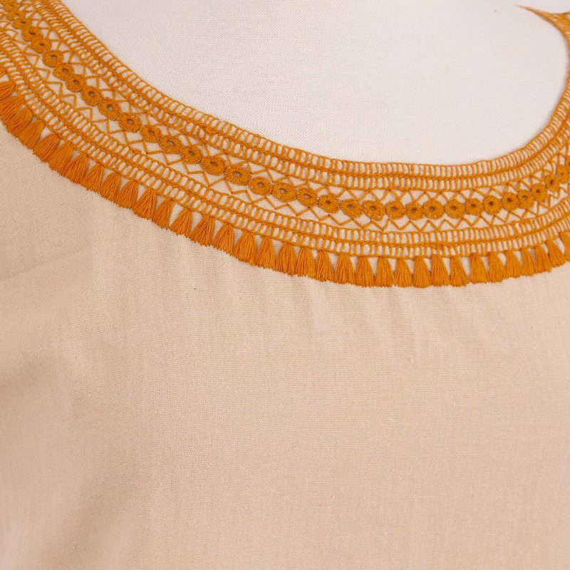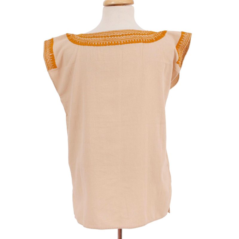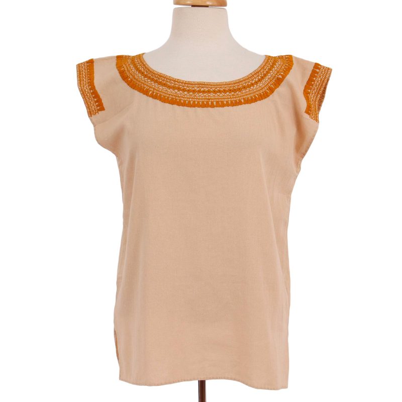 Featuring a solid color in taupe, this delightfully feminine blouse from Mexico is designed by Maria Elena Lopez. She crafts this blouse from cotton, featuring hand-embroidered details in dark brown at the neckline and sleeves.