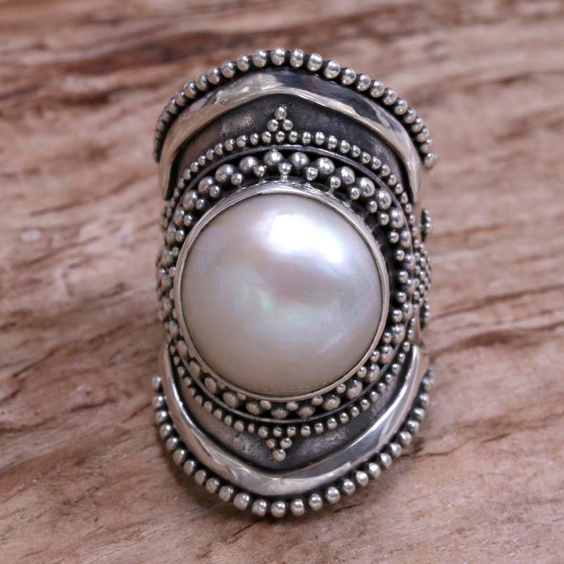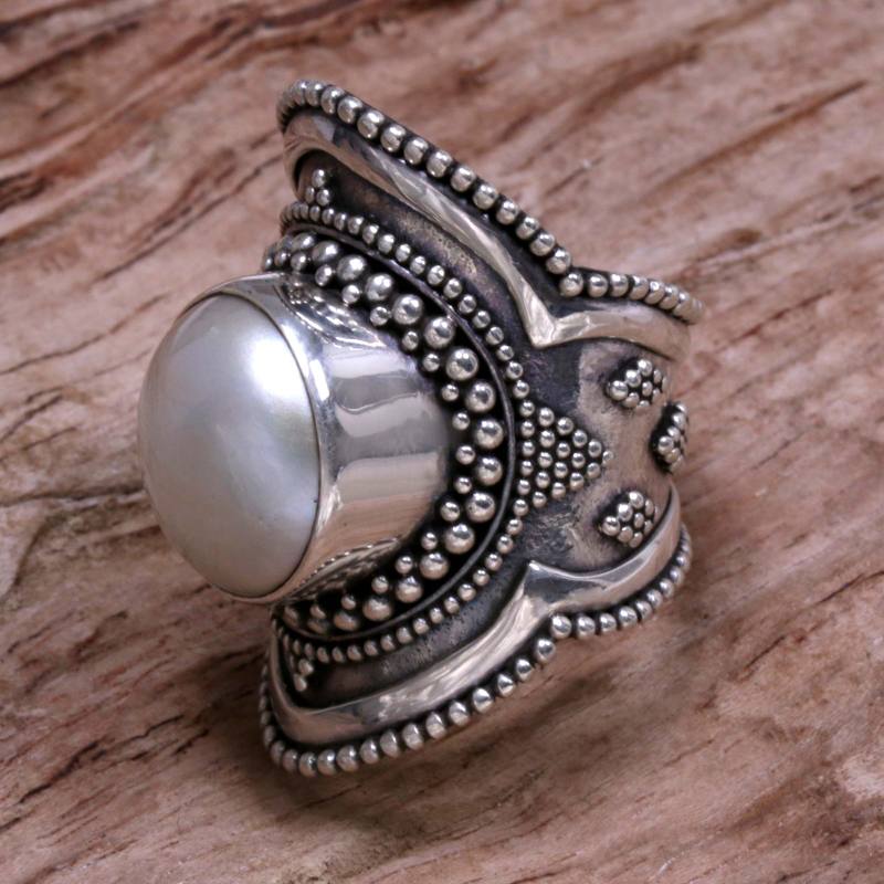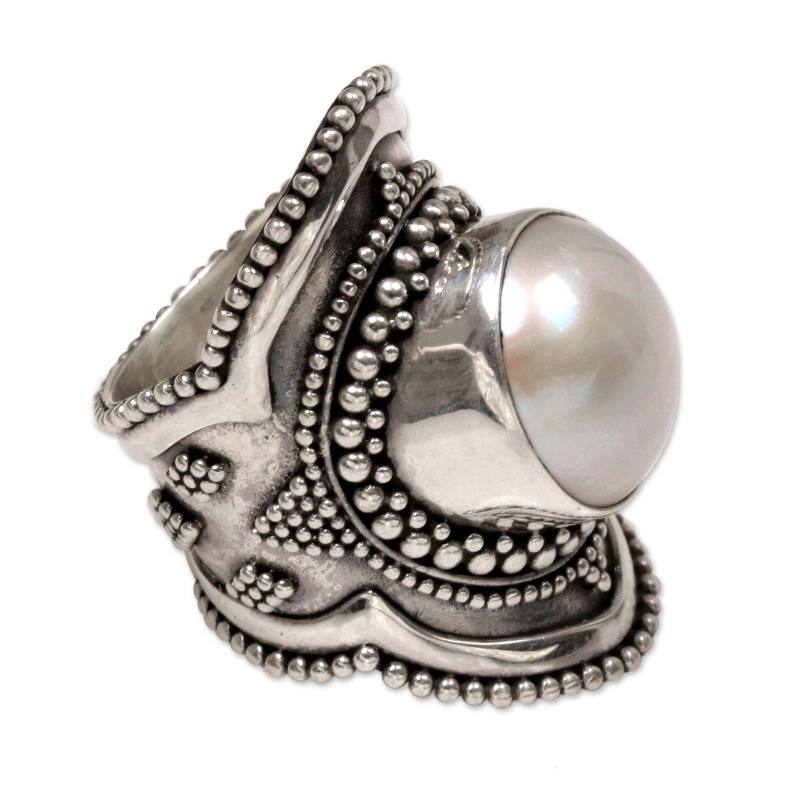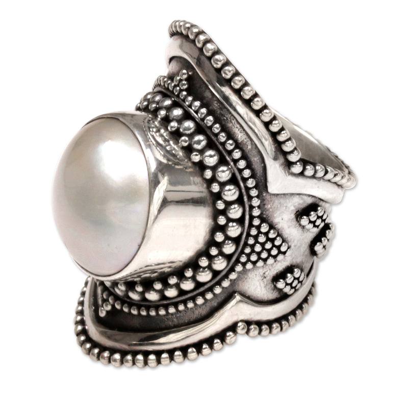 By Made Sudiari, this elegant cocktail is centered with a single cultured mabe pearl that glows like the full moon. The original design is handcrafted of sterling silver with traditional Balinese styling and petite dot motifs.