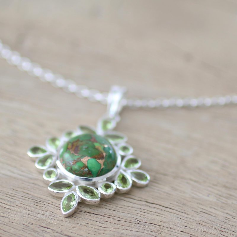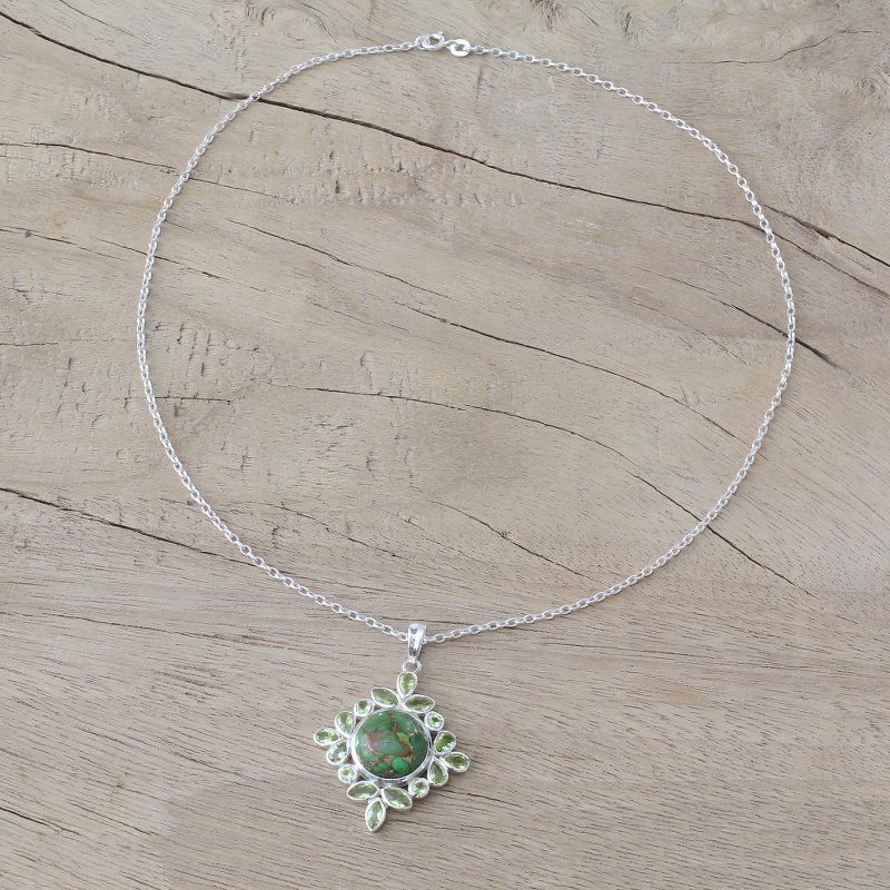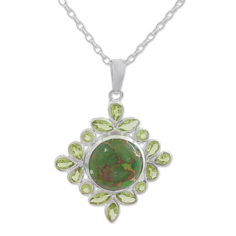 Backed by our 100% Happiness GuaranteeSparkling peridots with a total weight of 2.9 carats surround a mesmerizing green gem in this necklace from Alok Jain. Handcrafted of sterling silver, the necklace is uniquely captivating with the mesmerizing color and coppery veins of composite turquoise.