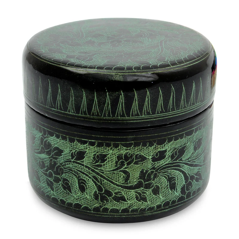 Nantana Sompamitre orchestrates a floral revelry detailed in green for the design of this decorative box. Hand-carved of mango wood, the etched images are underscored by glossy black lacquer in the tradition of Thai décor.