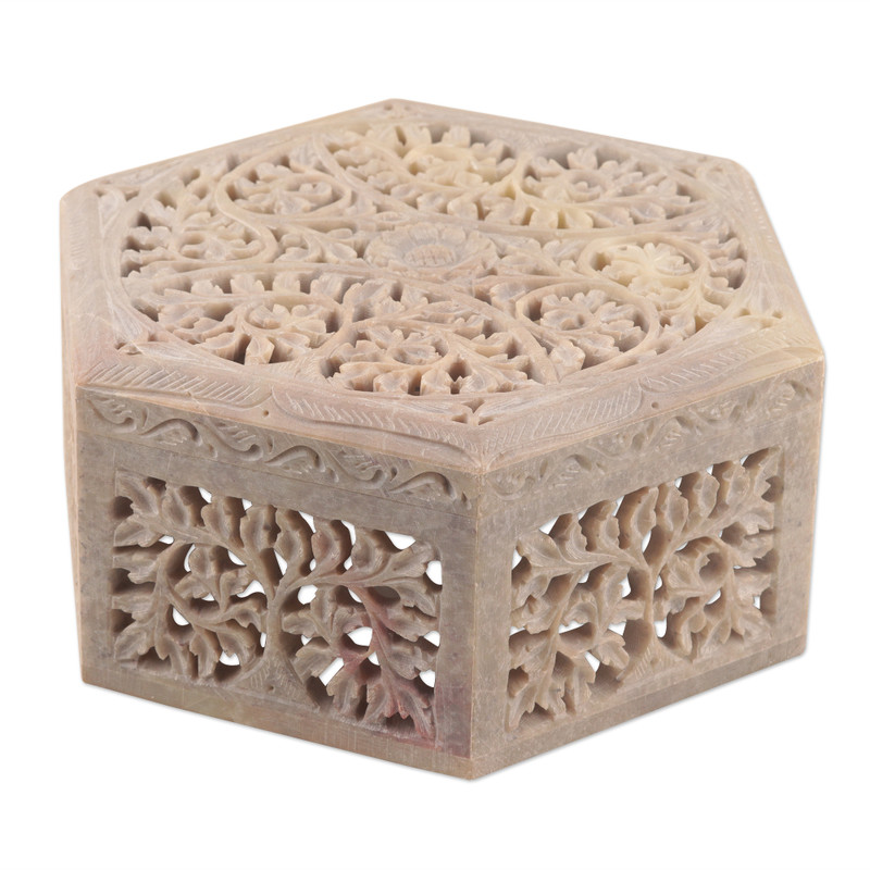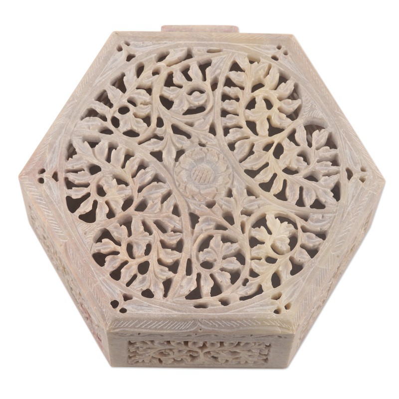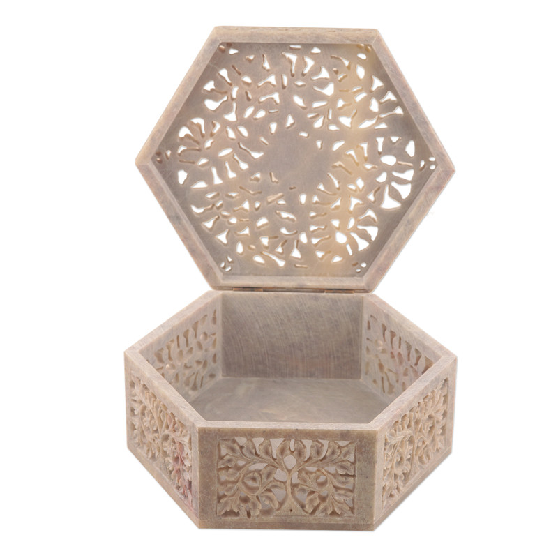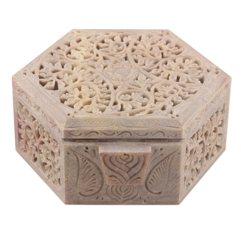 Swirling and happy leafy vines grow in abundance in this magnificent jewelry box designed by Gulam Rasool. A floral blossom rests in the center of the leafy vine pattern on the top of the natural soapstone box. The eye-catching hexagonal box is designed with artistic jali openwork portraying the beauty of ancient India. Two hinges facilitate the opening and closing of the box.