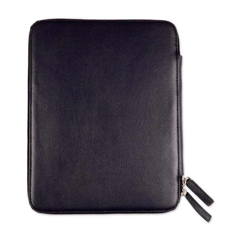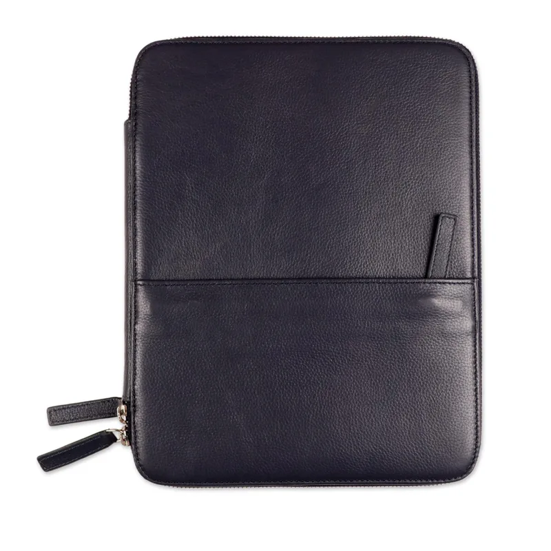 The ultimate organizer, this compact, elegant travel folio makes every trip a breeze. In navy blue leather, the full zip around case features pockets for bank cards, cell phone, journals and passport. Snap tabs hold cables or eyeglasses. An open sleeve is perfect for a tablet and a zipper pocket gives additional storage space for travel papers or boarding passes. The handy outer zip pocket keeps essentials secure.