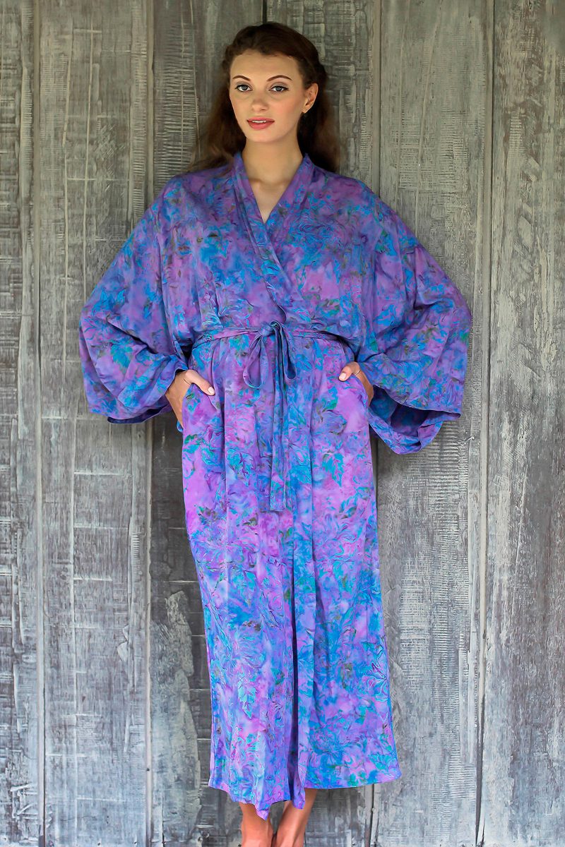 Backed by our 100% Happiness GuaranteeWrap yourself in the cool comfort of this luxurious long-sleeved hand-painted robe. Designed by Balinese artisan Desak Nyoman Parwati, this one-size-fits-most robe showcases unique patterns of purple, green and light blue floral motifs are achieved with a combination of batik, a resist dyeing technique, and tie-dyeing. Lovely and comfortable, its flattering front-wrap style, wide sleeves and matching belt bring a touch of Balinese chic anywhere you are.