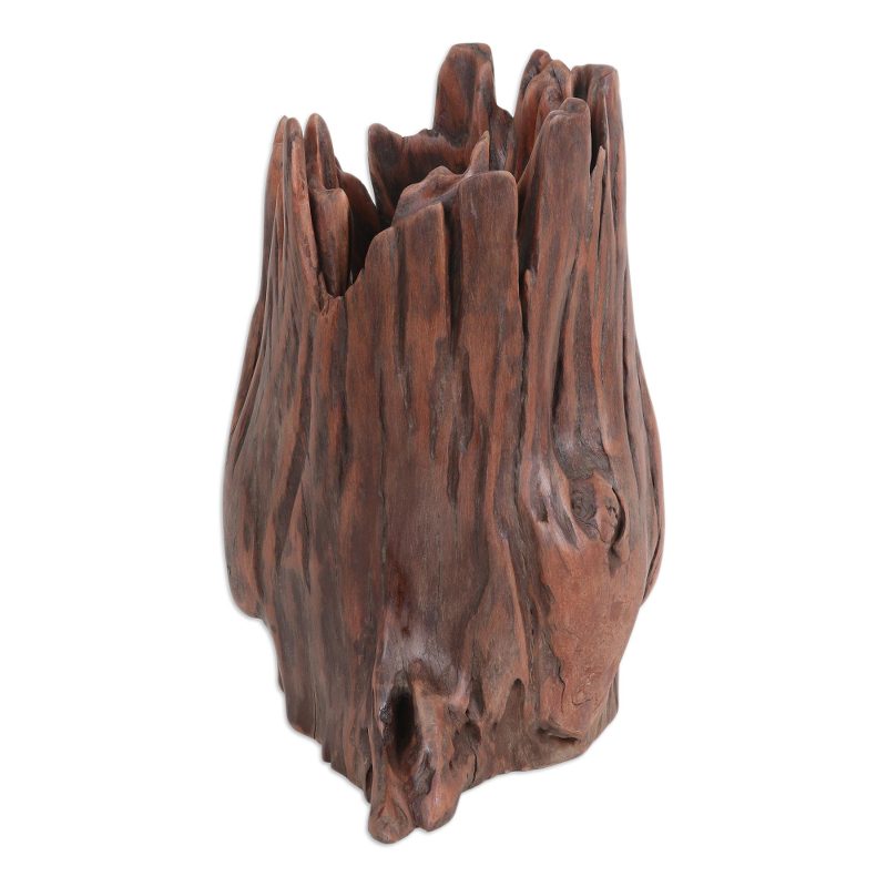 Determined to help the environment and reduce pollution, Indian artisan Suresh Pant hand-carves a captivating sculpture from reclaimed eucalyptus wood. With an abstract design reminiscent of a trunk, this work will add a relaxing and natural vibe to your interiors with its elegant natural tone.