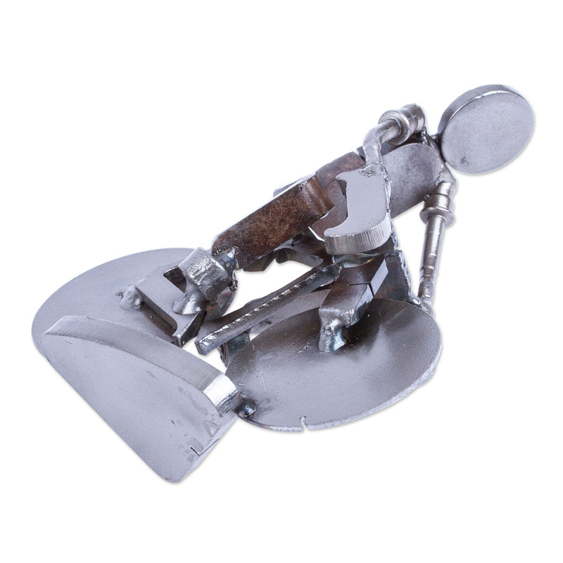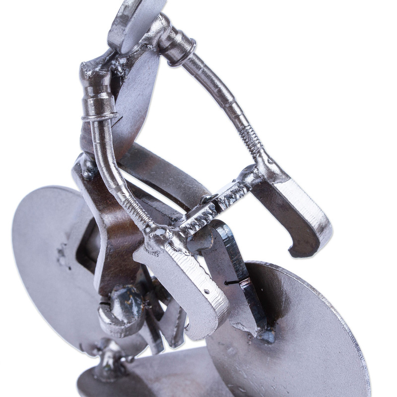 Hoping to help the environment through lovely creations, Mexican artisan Armando Ramirez handcrafts this statuette from recycled scrap metal, depicting a serene man biking. After long hours, the artisan adds a polished finish to his creation, making a high-quality design.