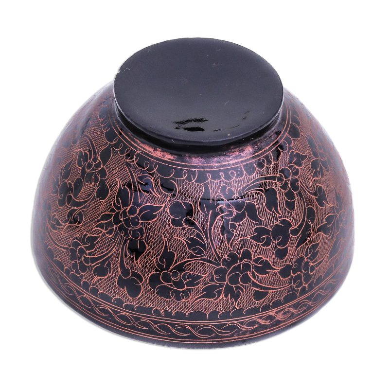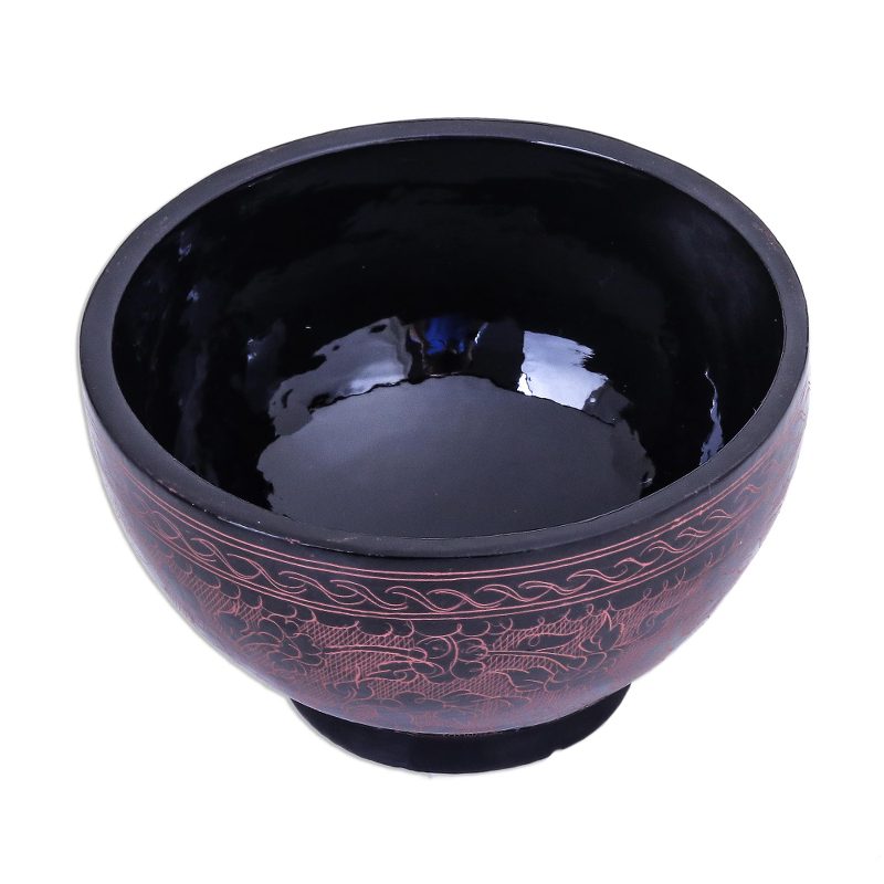 Glossy mango wood hosts a forest of flowers in a work of art by Nantana Sompamitre This exquisite bowl is lacquered inside and out; the red blossoms are etched by hand. She lathes the mango wood into the desired shape and coats it with lacquer. When dry, it is polished, and another coat is applied – up to twenty times – before as many six coats of pure lacquer are applied. The final layer is polished with powdered fired clay.