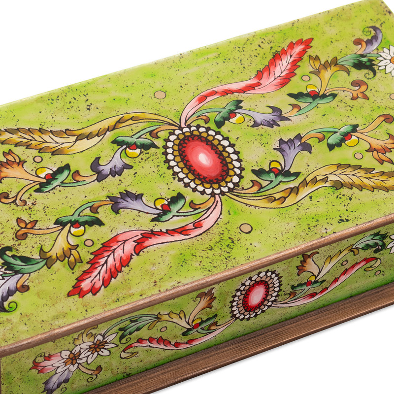 Backed by our 100% Happiness GuaranteeCentering floral tendrils on a cool green background, a single ruby hints at untold riches. Asunta Pelaez paints the motifs by hand on the reverse side of glass, giving them a colorful clarity. A traditional Cajamarca handicraft, the panes adorn a set of two gilded wood coffers.