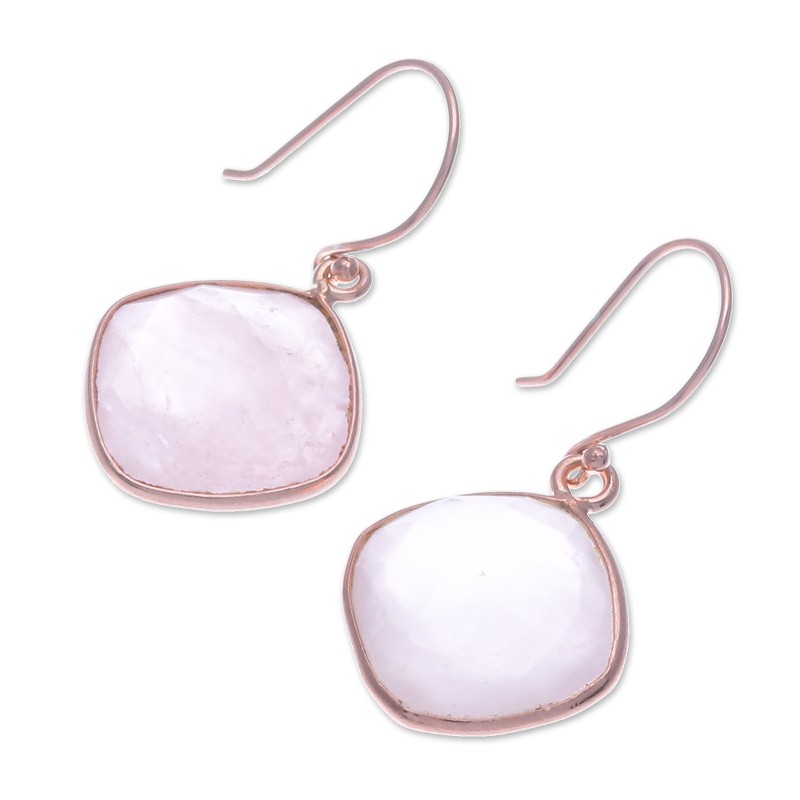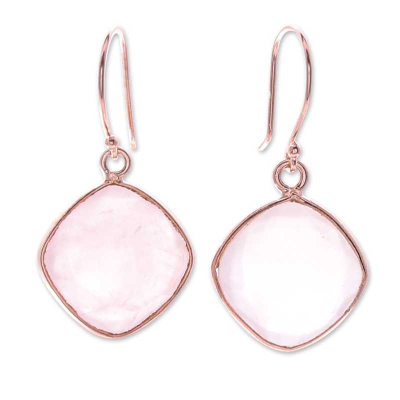 Checkerboard-faceted natural rose quartz with a sweet glow is stunning in these dangle earrings from Matta in Thailand. The artisan sets 12 carats of the gem in 18k rose gold plated settings to swing from hooks.