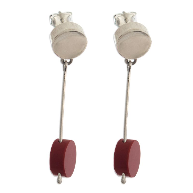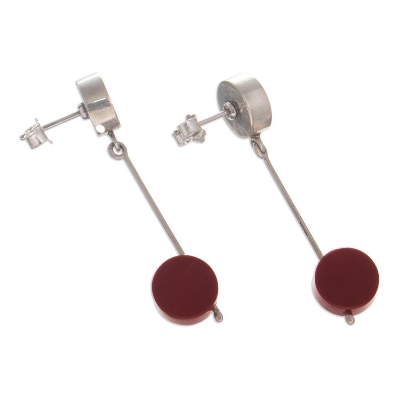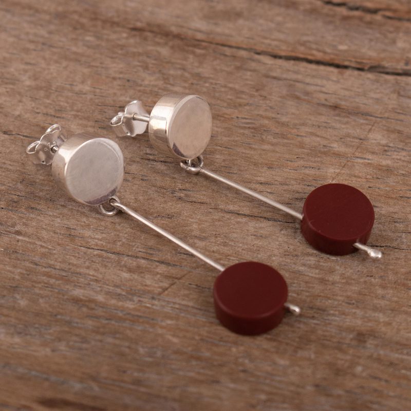 Peruvian artisan Leslie Granthon was inspired by the singular style of Spanish artist Joan Miró in creating these beautiful earrings. The dangle earrings are made from polished Andean sterling silver and accented with off-center discs of natural brick-red jasper.