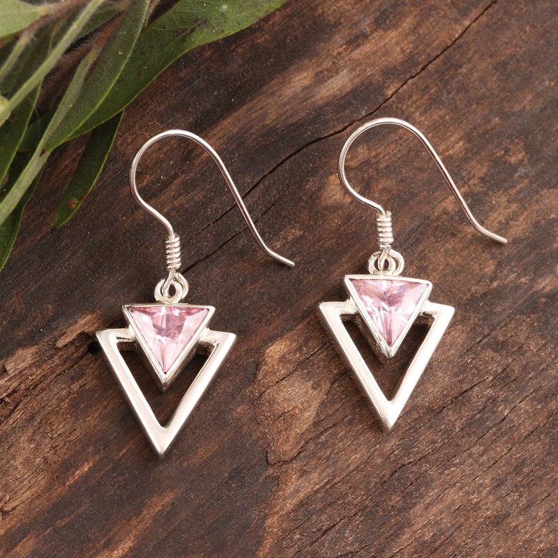 Sterling triangles indicate a single direction as sparkling stones move along the same path. By Shubhra Singh, this enchanting pair of earrings is chic and modern. Heat treated pink cubic zirconia adds delicate color.