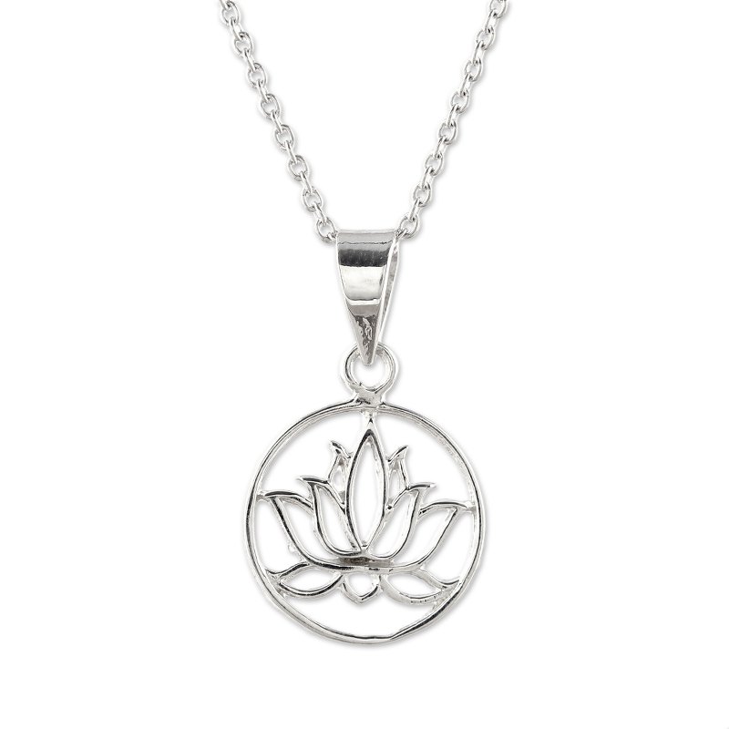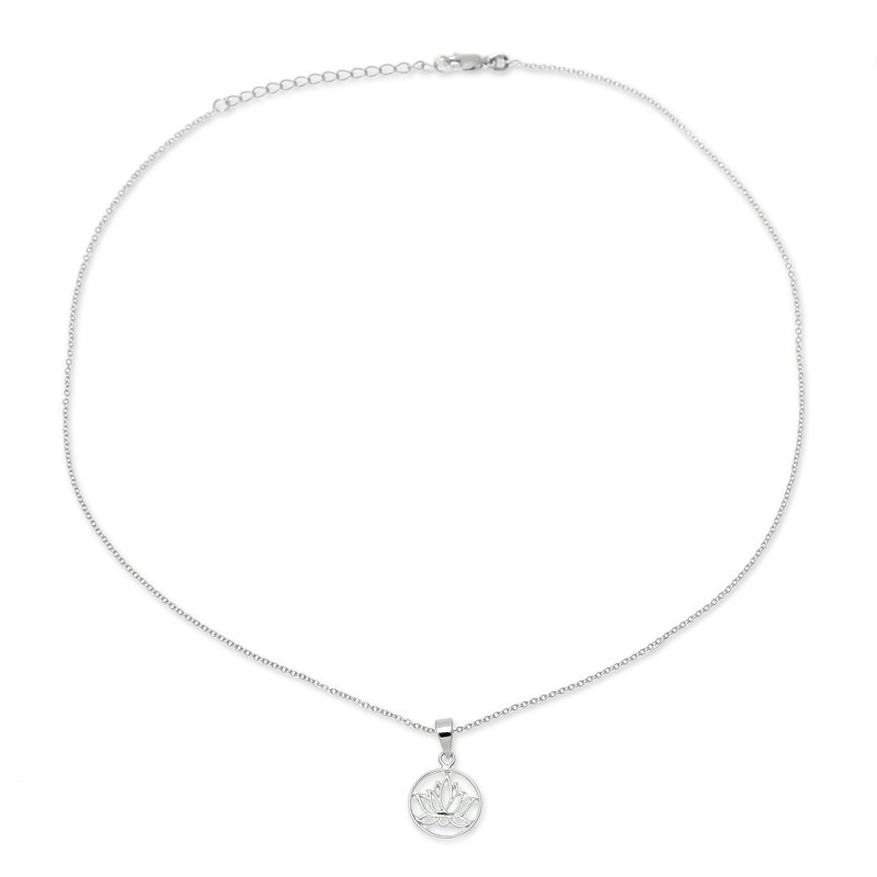 Backed by our 100% Happiness GuaranteeA lovely blooming openwork lotus is centered in a circular frame in this handcrafted sterling silver pendant necklace. Designed by Neetu Barathi of India, the lotus pendant hangs from a sterling silver cable chain that has an extender for ease in adjusting the length.