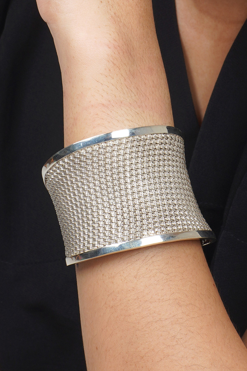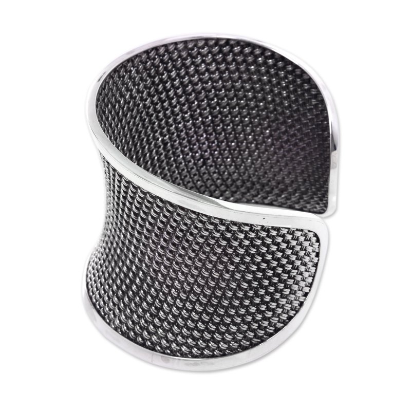 Bordered by bands of polished silver, sterling strands are intricately woven in a rattan-like pattern. Komang Suastra crafts this stunning bracelet, creating a wide, concave cuff.