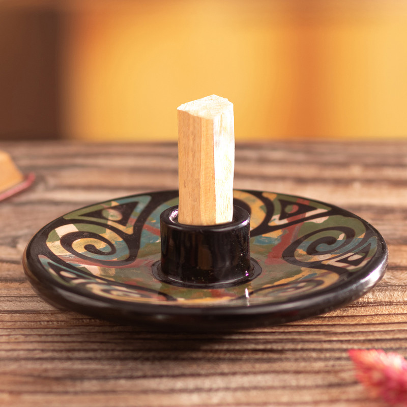 Green and black hues embellish this sublime creation by Jesus Rivas from Peru. Inspired by the ancient civilizations that once ruled the continent, the artisan creates this round ceramic incense holder following the Vicus culture style, which allows him to add a captivating swirl pattern to the piece, transporting you to the splendorous era of the pre-Columbian America.