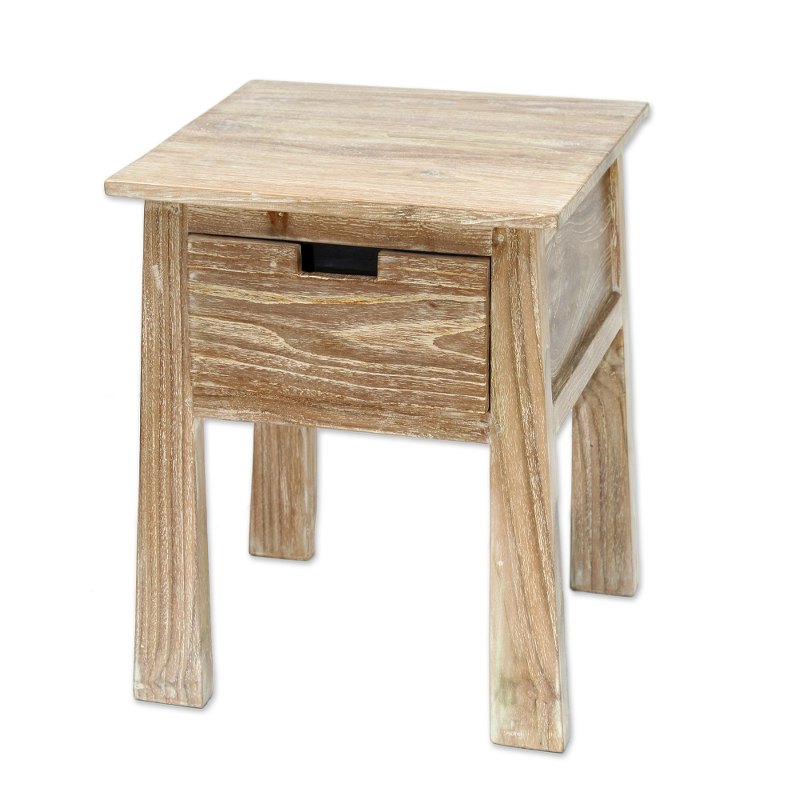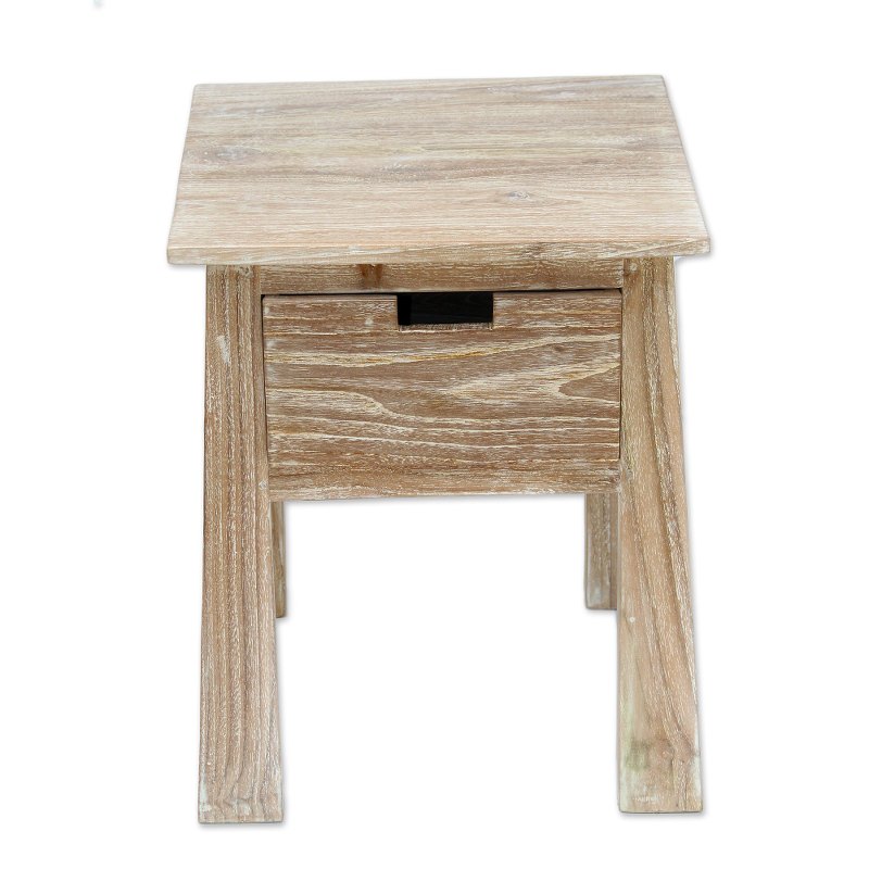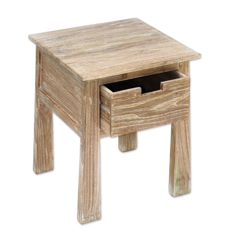 Made Sadia of Indonesia presents a lovely accent table handcrafted from teak wood. The single drawer table is whitewashed, giving it a light color while allowing the beautiful natural grain of the teak wood to show through. The table's legs gradually taper toward the top, for a look reminiscent of the craftsman style.